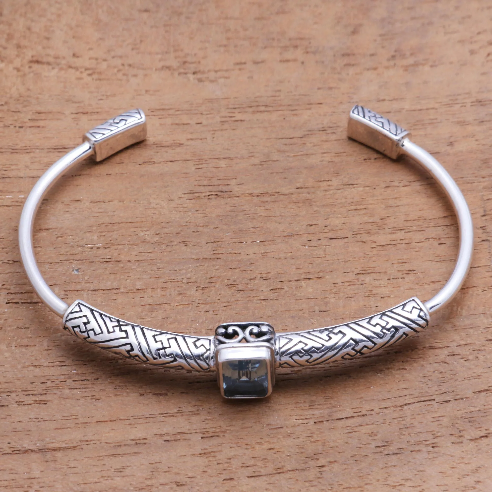 A delight of the imagination, this cuff bracelet flanks a 3.5-carat blue topaz gemstone with geometric patterns in combination-finish sterling silver. Wayan Neri designs this wonderful bracelet from Bali.