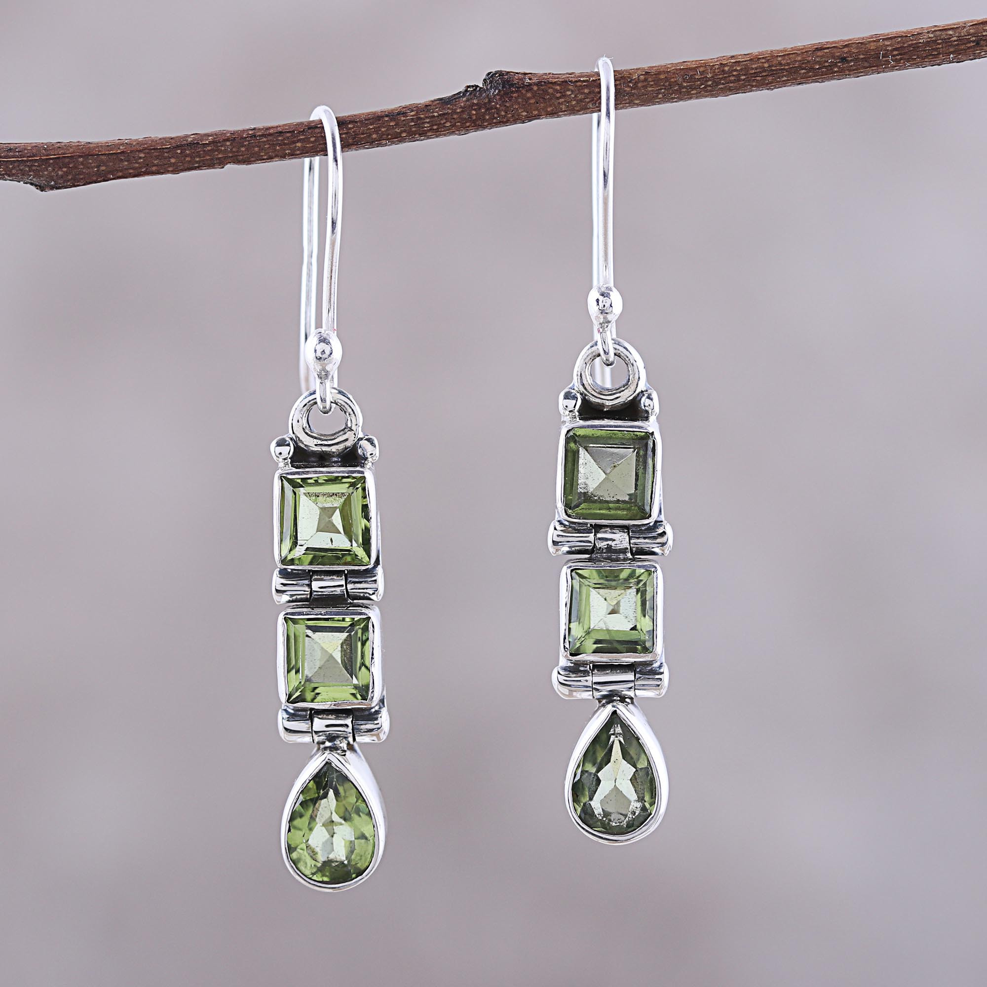 Totaling 3.8 carats, squares and pears of natural green peridot are displayed in these dangle earrings from India. Neeru Goel presents these swinging earrings, which are crafted with sterling silver.