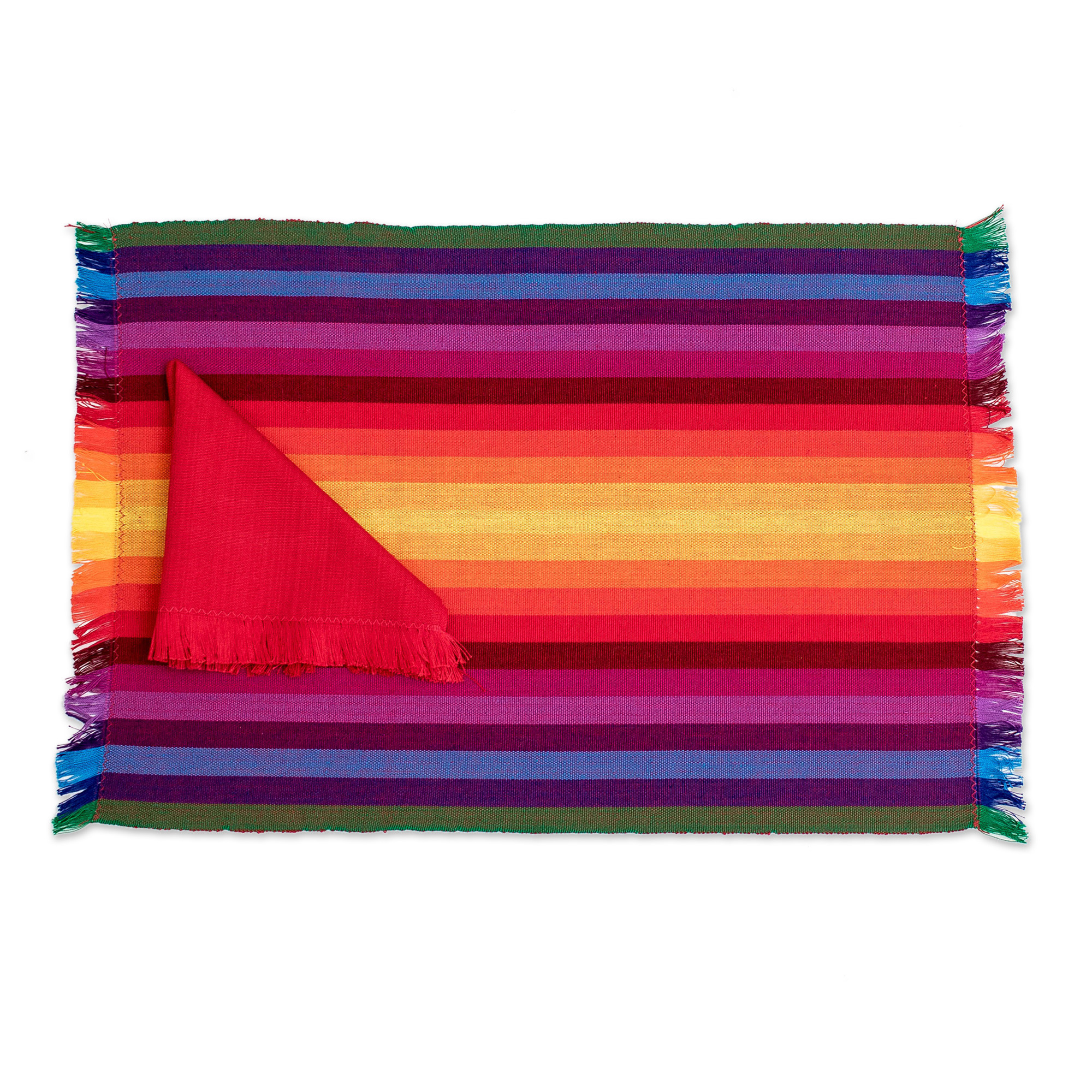 4 Handwoven Striped Cotton Rainbow Placemats with Napkins, 'Palopo Rainbow'