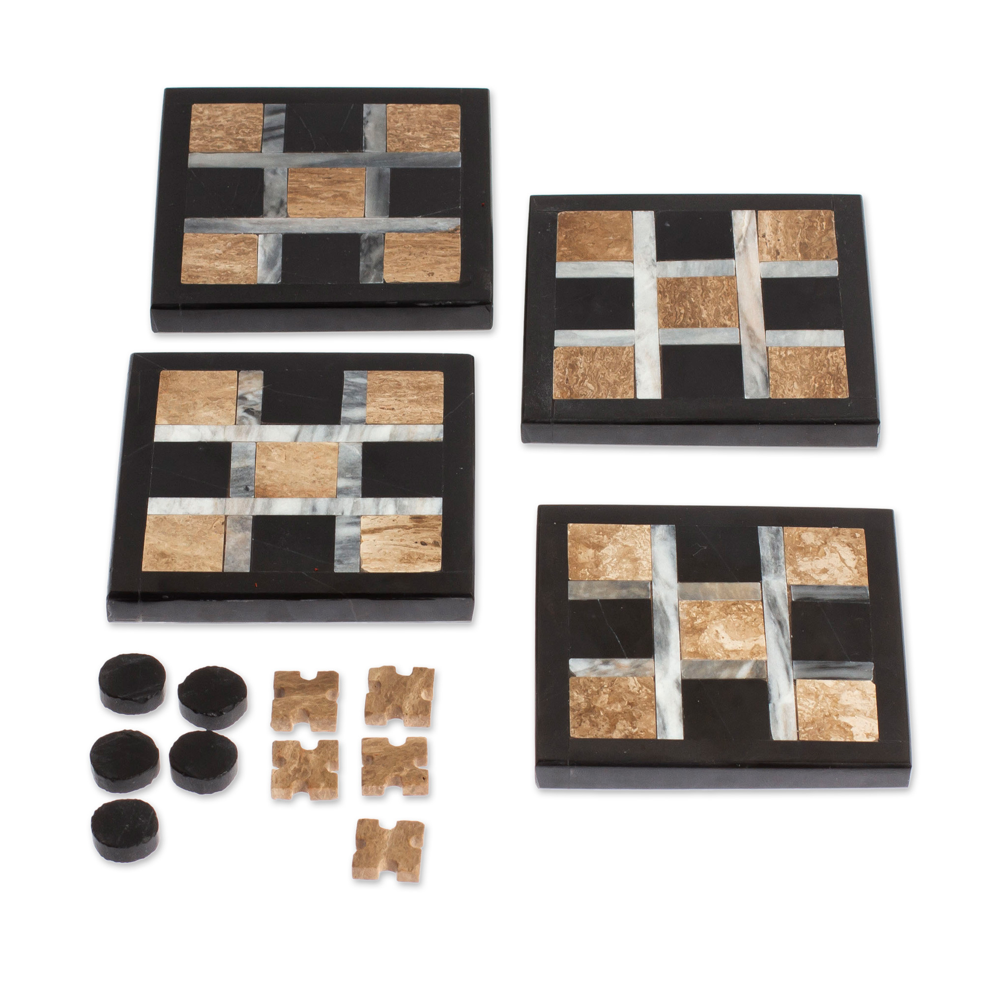 4 Modern Onyx and Marble Coasters with Tic-Tac-Toe Set, 'Fun Dining'
