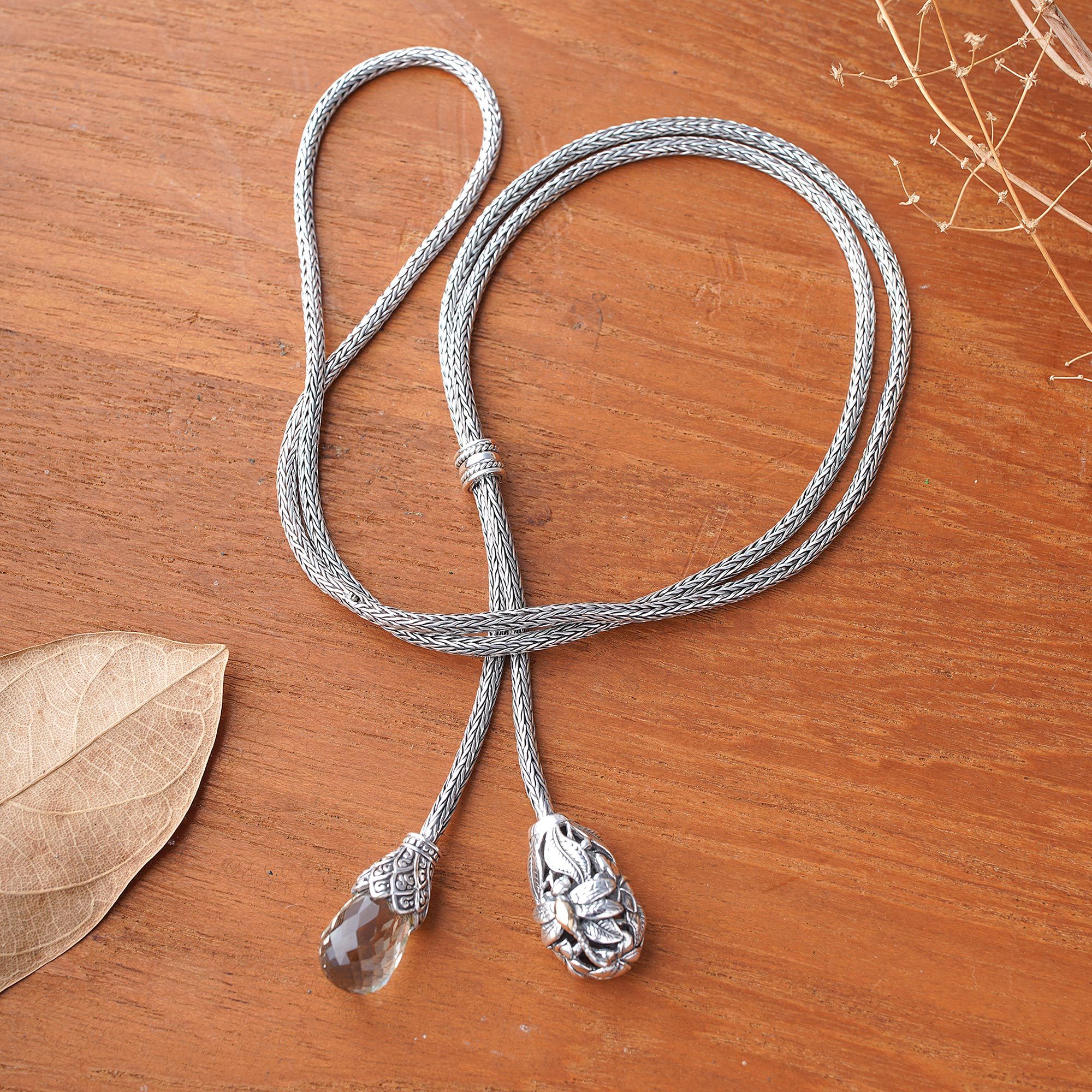 This sublime lariat necklace transforms movement into poetry with its fluid sterling silver design cascading naturally around the collarbone. The dual pendants feature an impressive five-carat prasiolite gemstone that captures ethereal green hues and delicate dragonfly and leaf details that pay homage to nature's beauty, accented by warm 18k gold touches that add luxurious contrast. Created by Bali's Dewi Putera, this versatile accessory offers multiple styling options, letting you customize the drape and silhouette to match your mood or outfit perfectly.