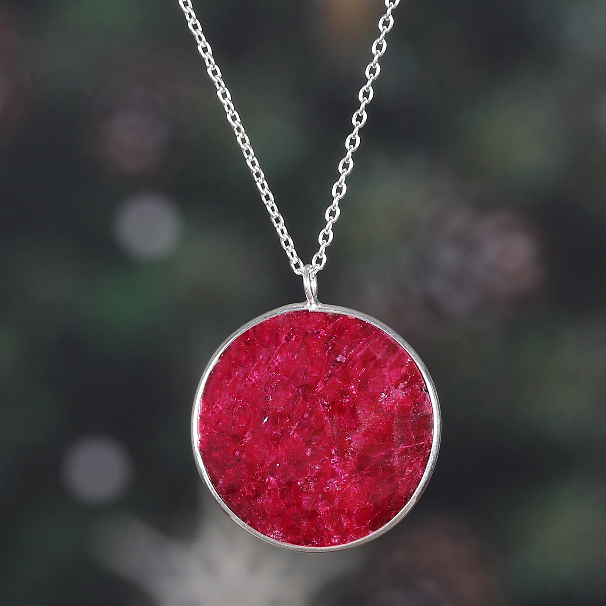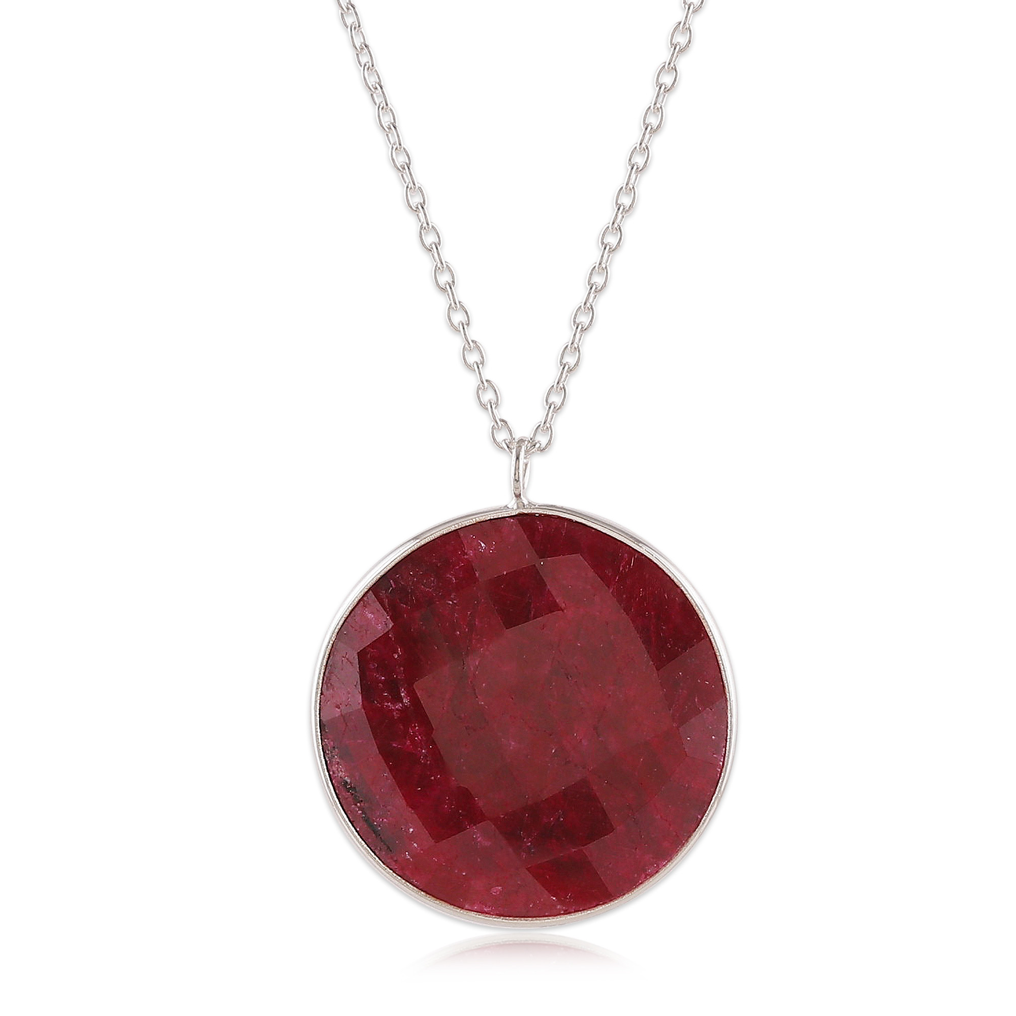 The sun of your days and the moon of your nights—this sterling silver pendant necklace arrives from India to paint every instant in a capricious red hue. Designer Neetu Barathi honors the beauty of the ruby gemstone with this minimalist piece, showcasing a 58-carat faceted checkerboard jewel.