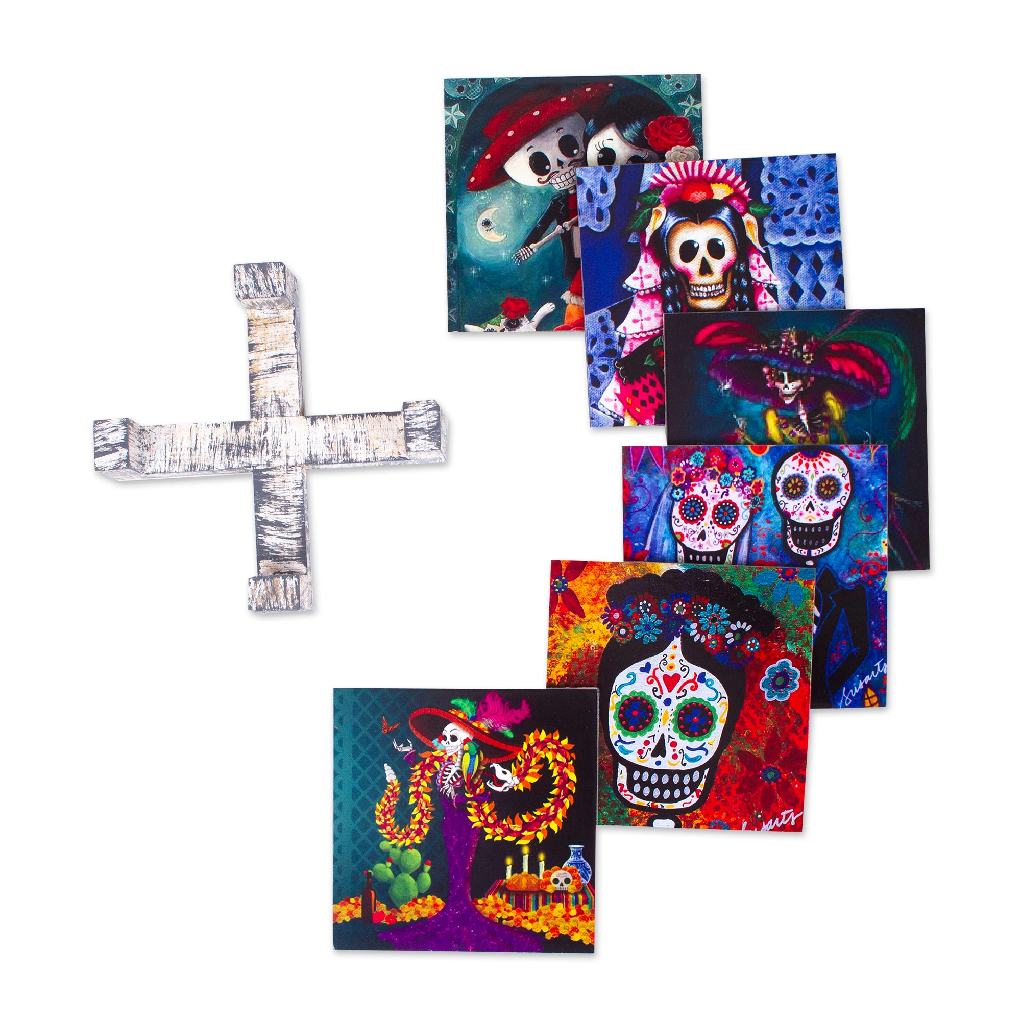 Mexico's beloved skeletal lovers, Catrina and Catrin, are the stars of this set of six pinewood coasters filled with an enchanting aura. Ana Maria Gonzalez transforms wood into a cultural treasure through meticulous decoupage, capturing the playful spirit of Day of the Dead traditions in each carefully crafted piece. Between uses, these functional accessories nest neatly in their accompanying holder.