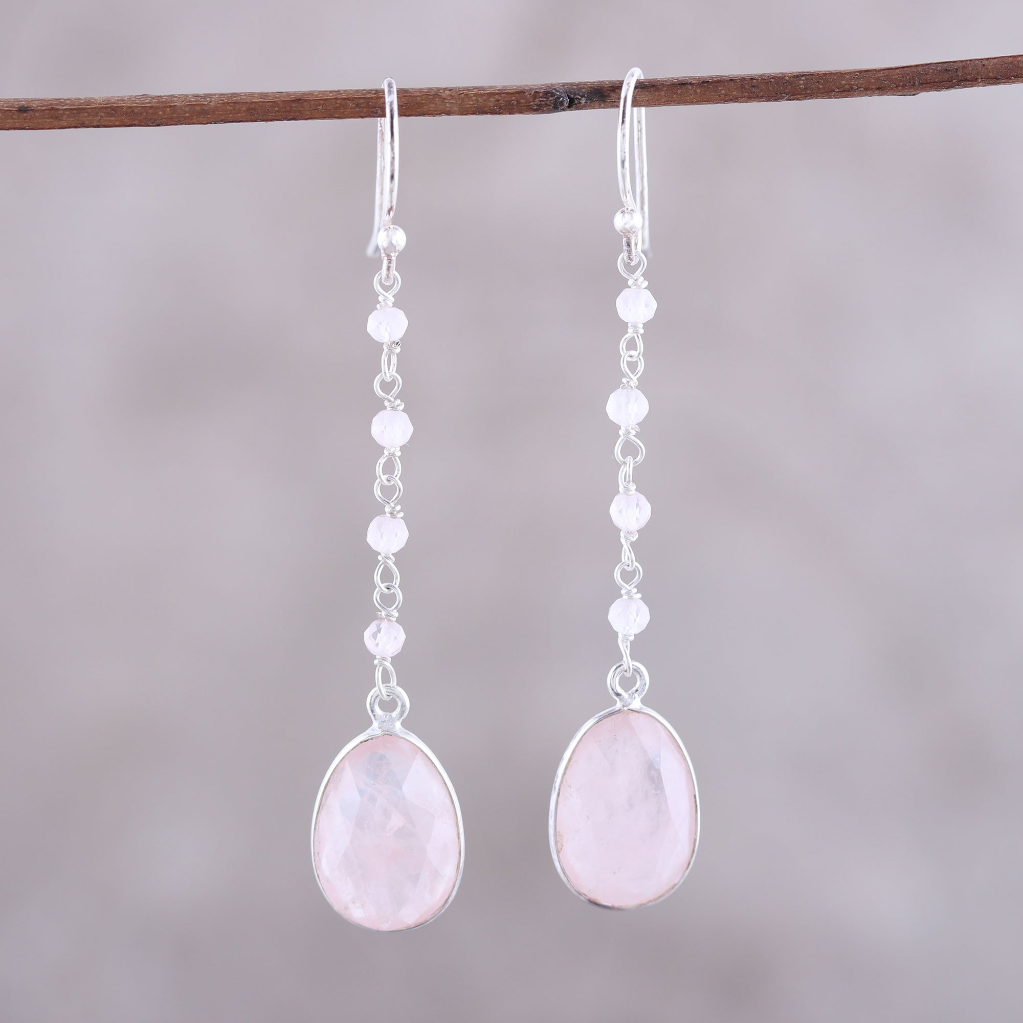 Raining down like watery drops, soft pink rose quartz gemstones fall from the ears, punctuated by glistening ovals at the bottom of these Indian dangle earrings. Neetu Barathi designs the earrings, crafting them with hooks and links of sterling silver.