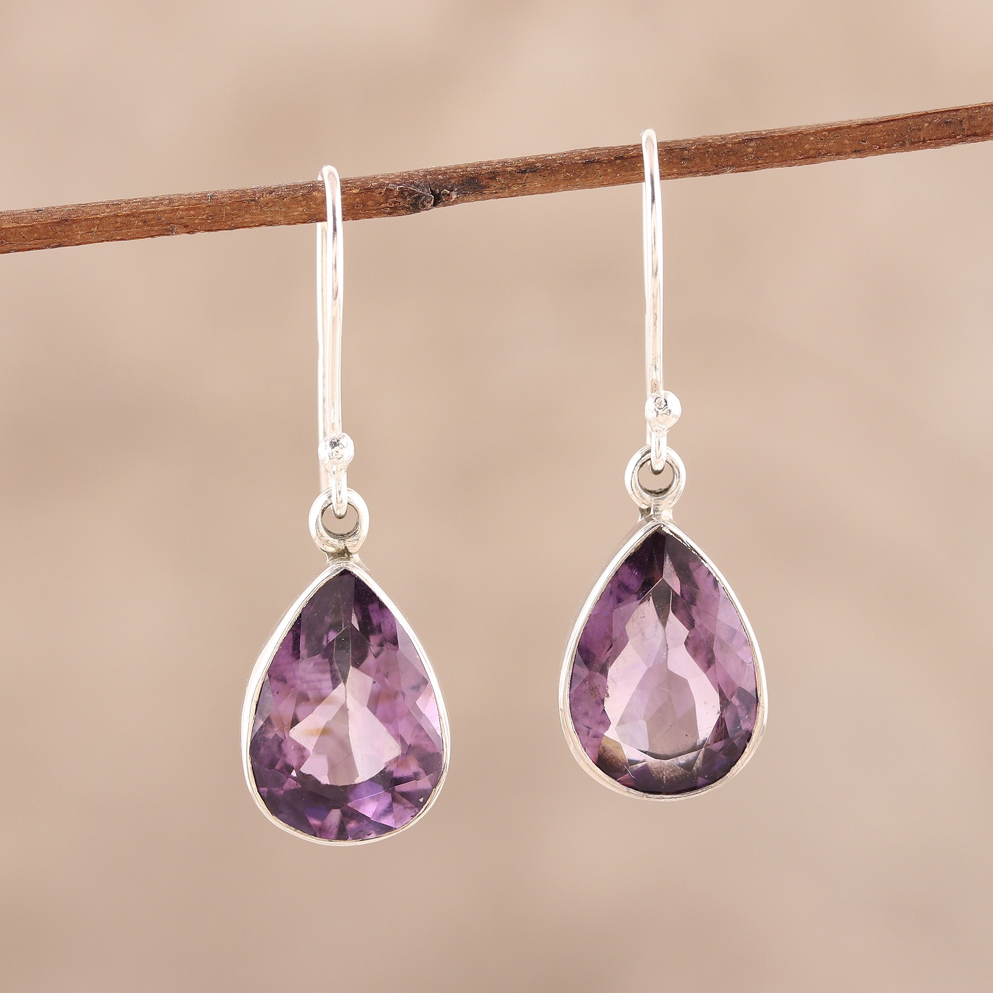 Glimmering with purple hues, two teardrops of faceted amethyst weigh nine carats. Neeru Goel presents these Indian dangle earrings, which are crafted with high-polish sterling silver.