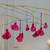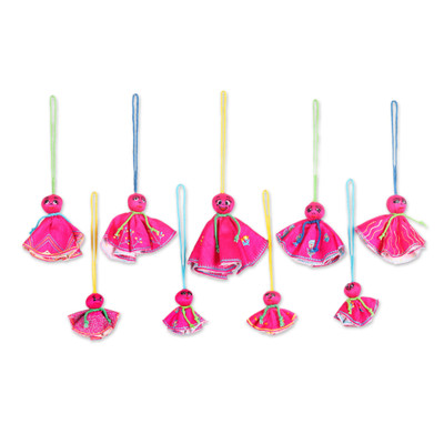 9 Fuchsia Hand-Embroidered Viscose Doll Halloween Ornaments, 'Fuchsia Spooky Dolls'