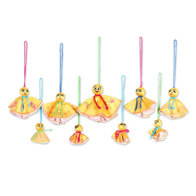 9 Hand-Embroidered Yellow Viscose Doll Halloween Ornaments, 'Yellow Spooky Dolls'