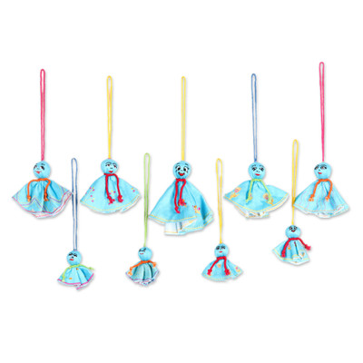 9 Turquoise Embroidered Viscose Doll Halloween Ornaments, 'Turquoise Spooky Dolls'