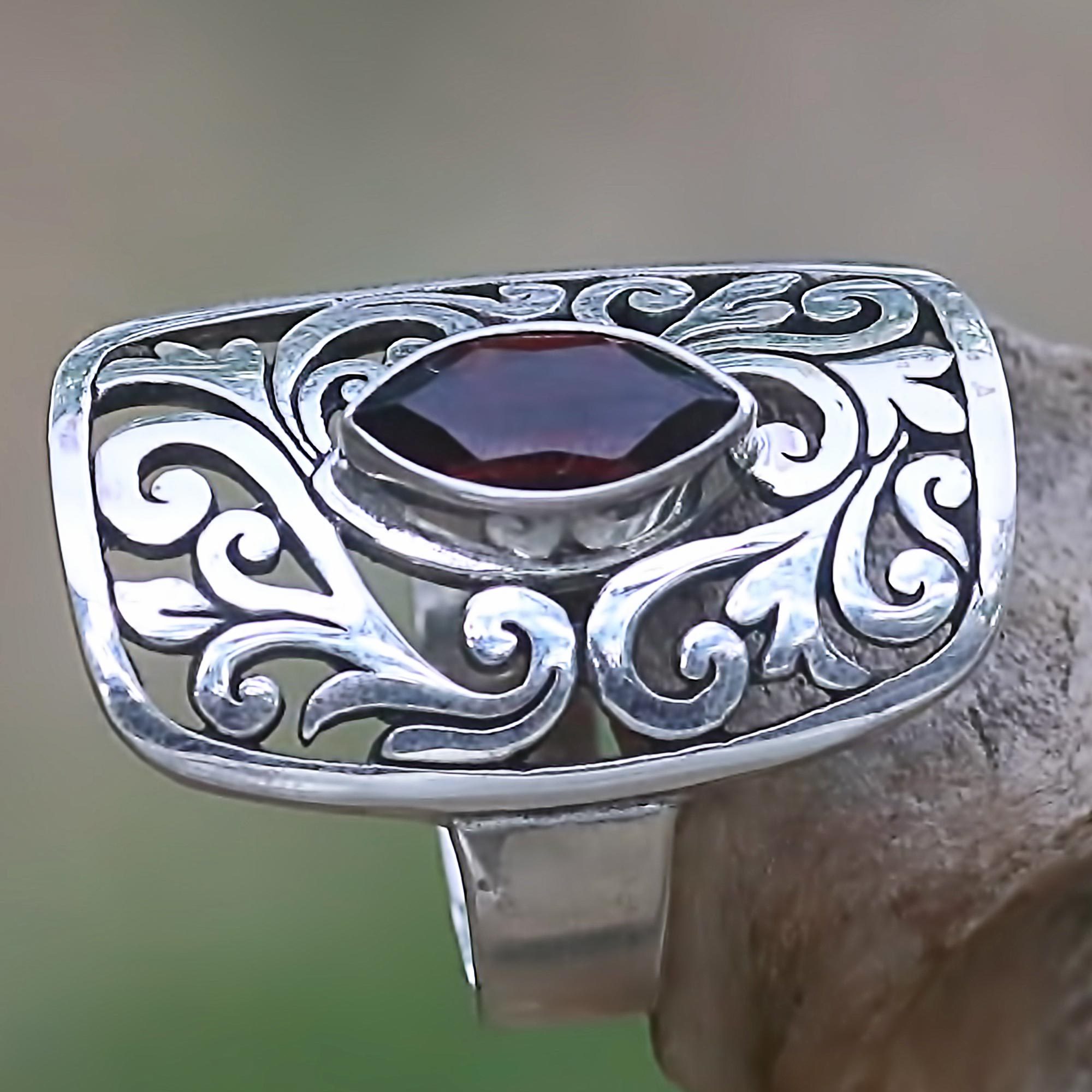 Garnet lends its fiery dramatic beauty to this Balinese cocktail ring designed by Wirabhuwana. He works in sterling silver, masterfully crafting the ring's lavish crown in leafy openwork.