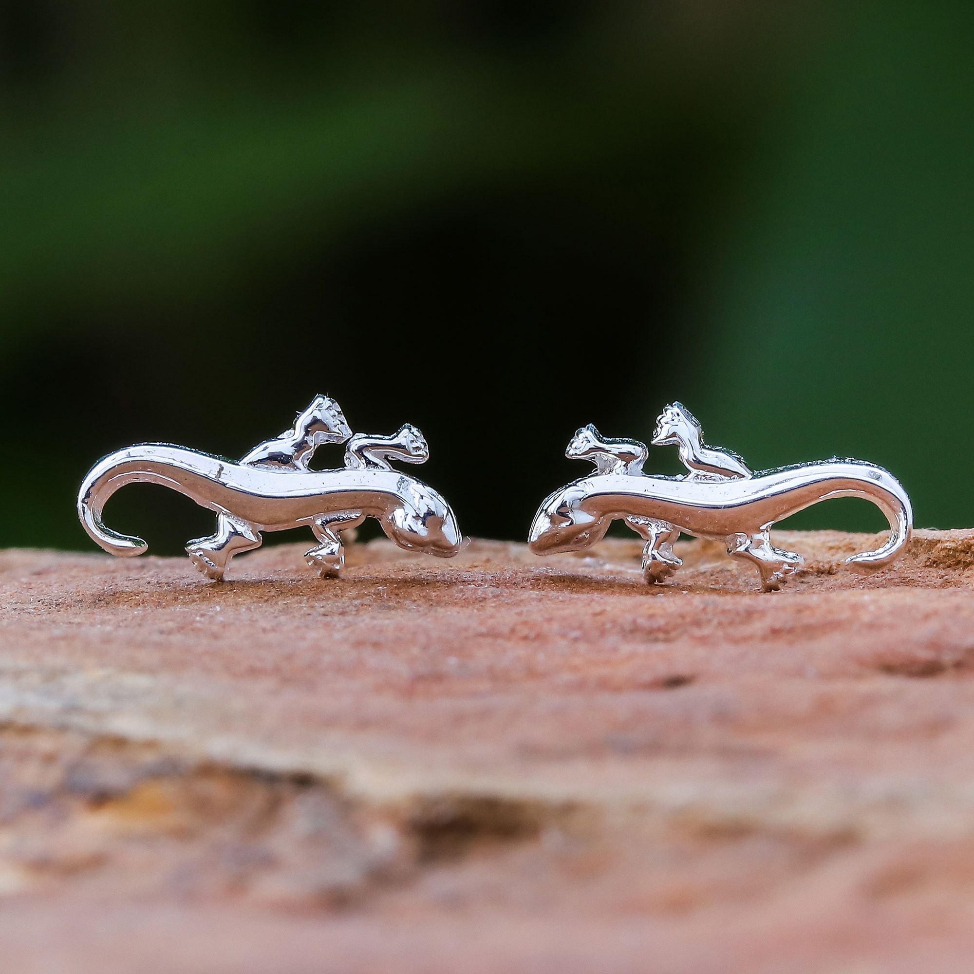 Sleek and slender, tiny salamanders become novel stud earrings. Lalana in Thailand depicts the sinuous creatures in polished sterling silver.