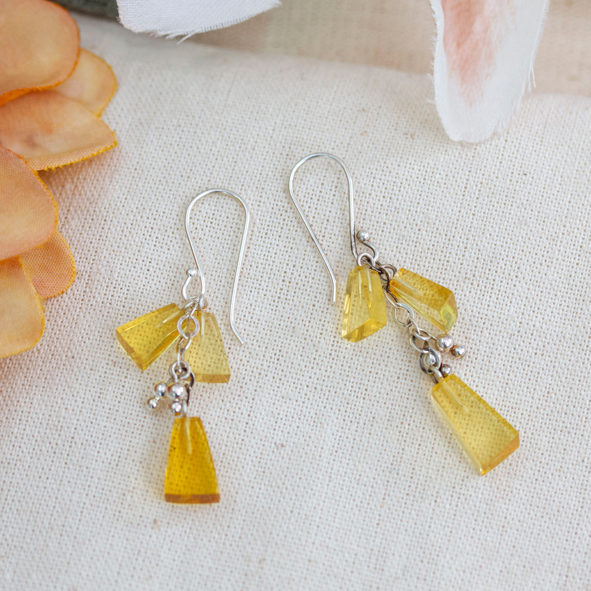 Add a subtle golden glimmer to your looks with this elegant pair of earrings. Jacqueline and Eddy craft them from 925 sterling silver and decorate them with a cascade of hand-carved triangular pendants of natural amber.