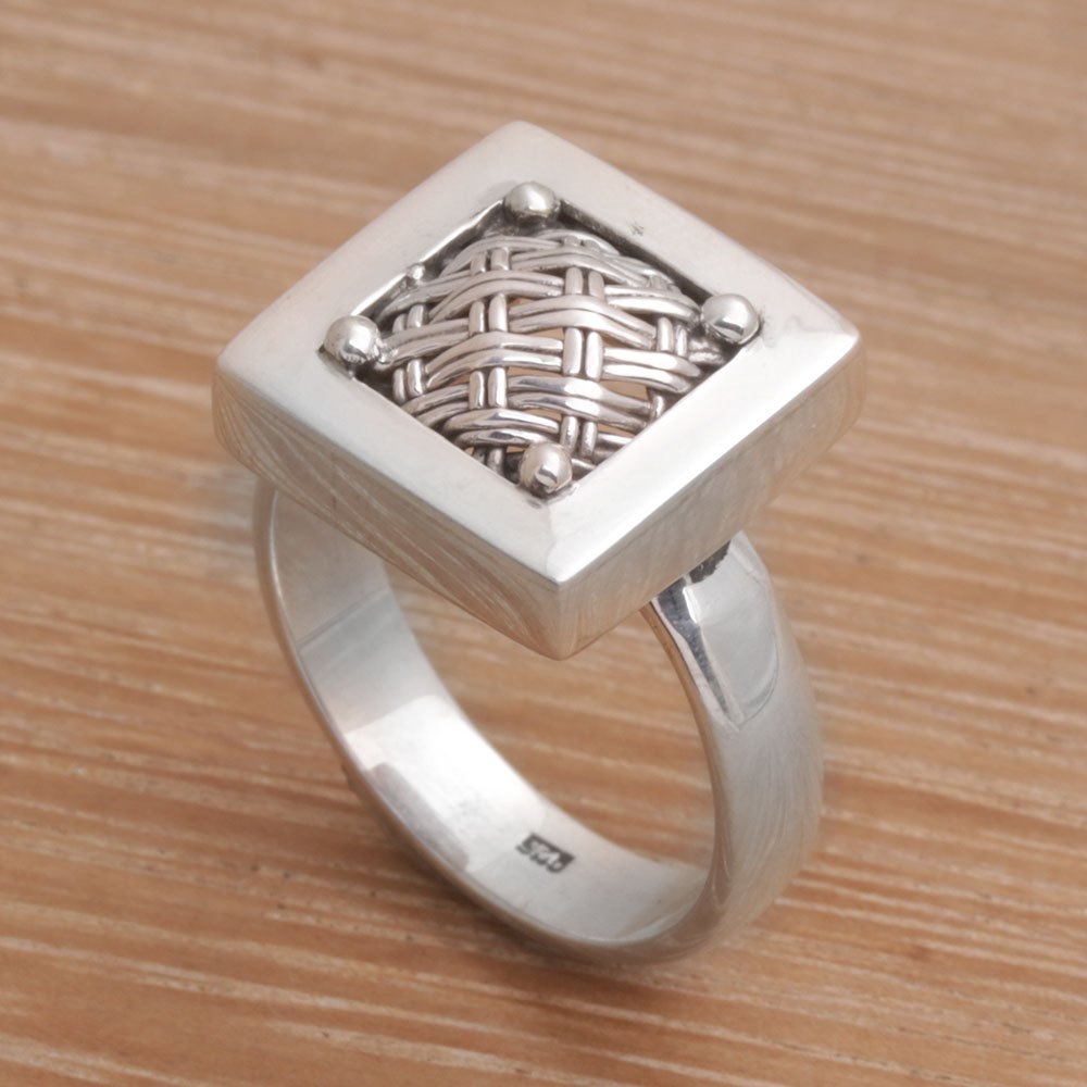 925 Sterling Silver Basket Weave Balinese Cocktail Ring, 'Weaving Ketupats'