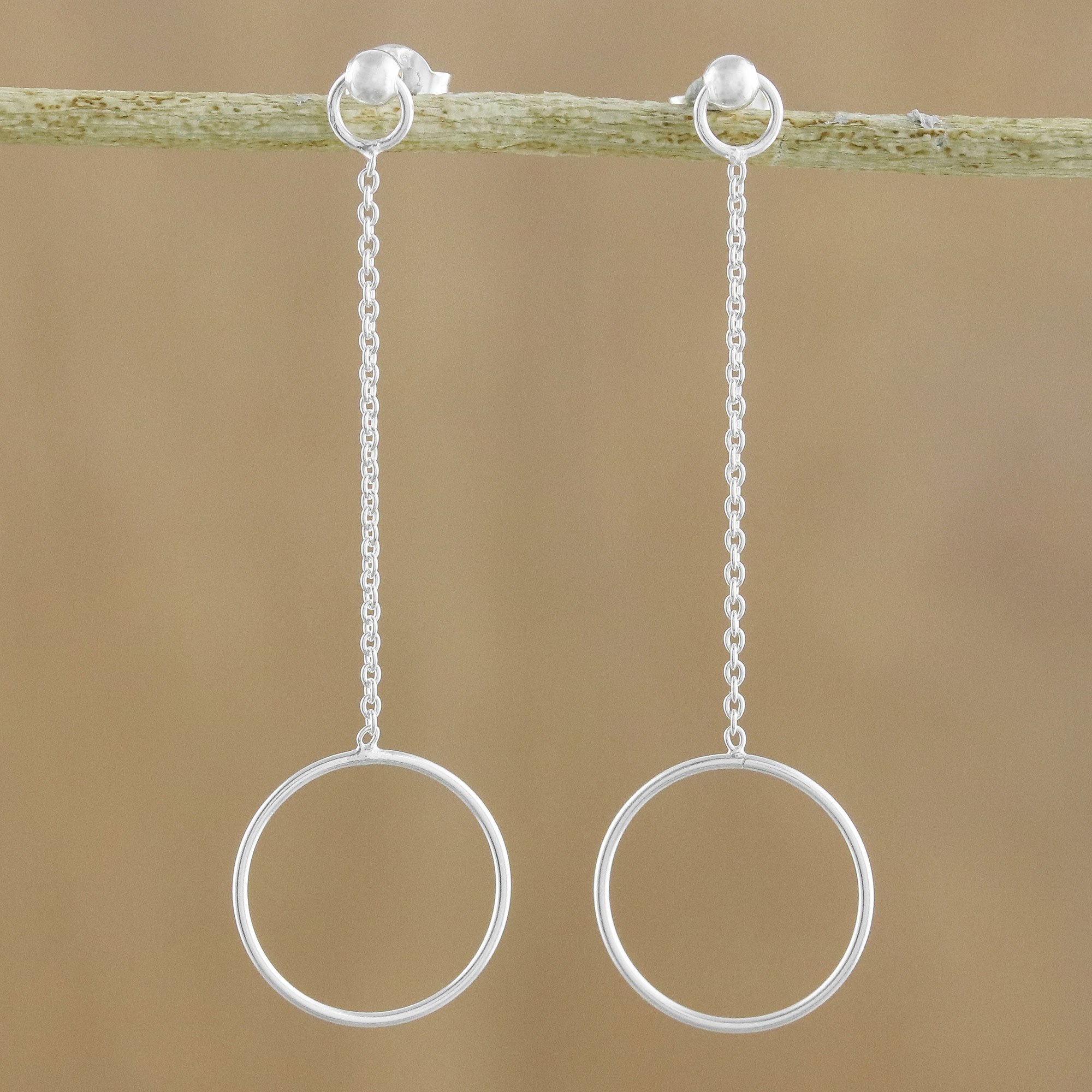 Artisan Lalana of Thailand hand crafts this eye-catching pair of dangle earrings. Made from sterling silver, these post earrings feature silver circles suspended from a chain.