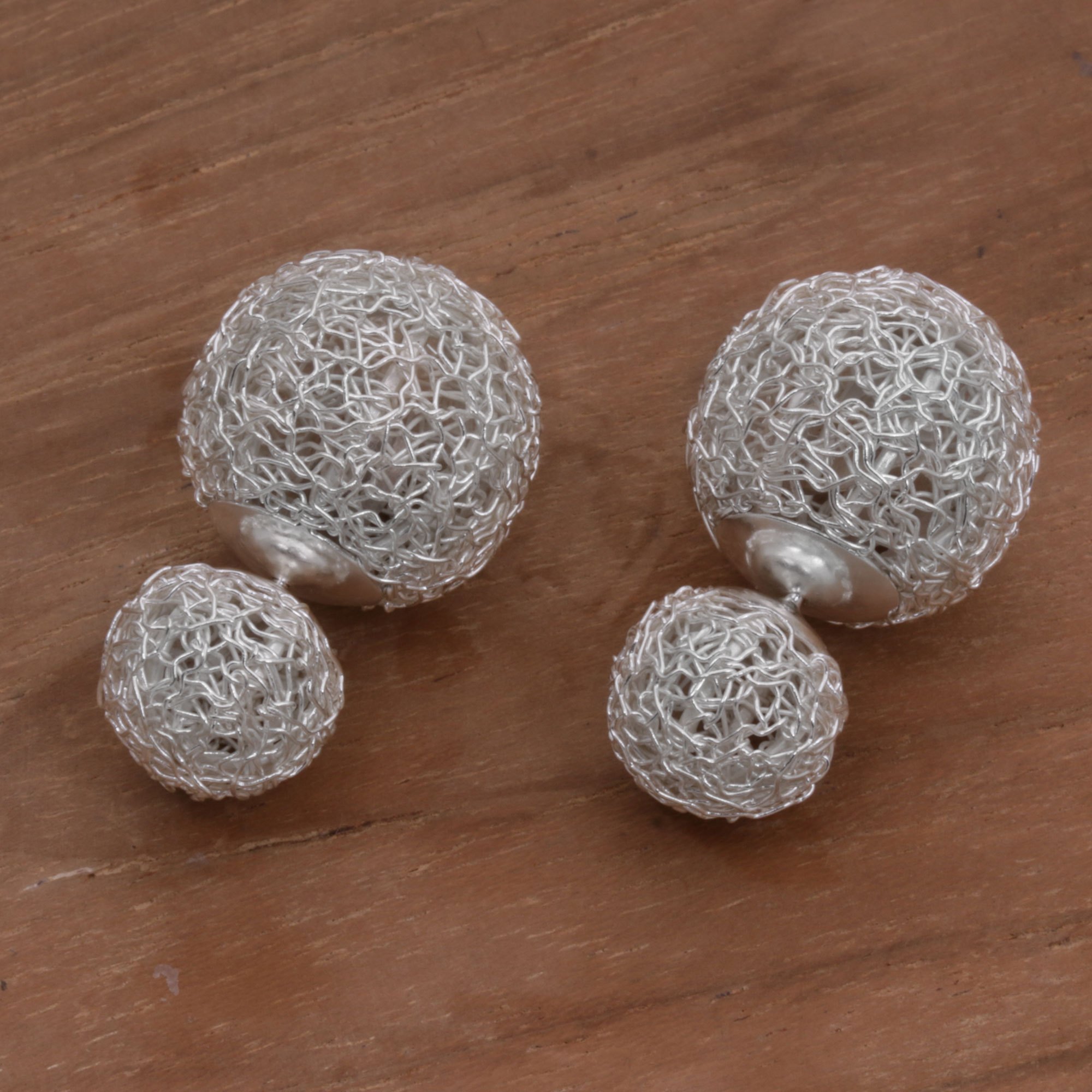 This pair of button earrings from Bali is handcrafted with sterling silver wire to resemble two round, shimmering nests. Attached to the ears on posts, these screw-back earrings feature a reversible design with petite versions of the earrings located at the back.