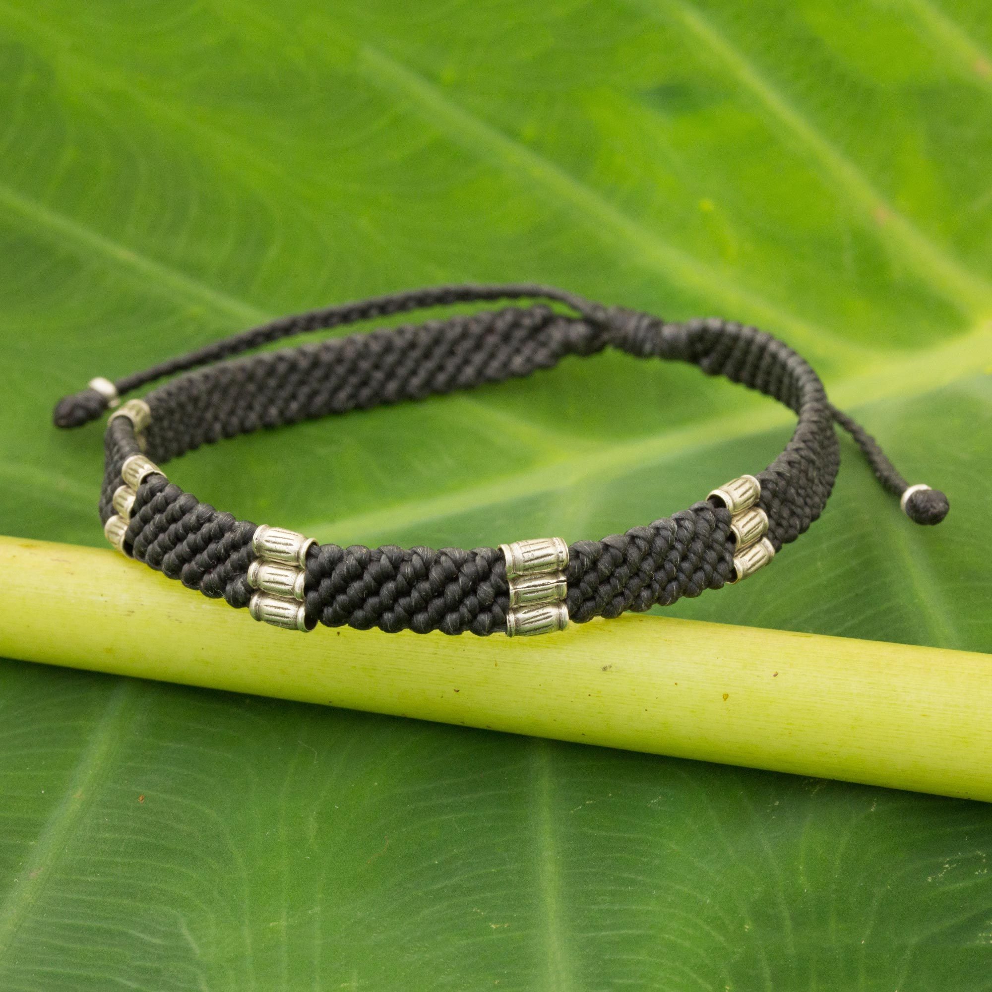 Thai artisan Napapat designs this braided bracelet with techniques that the Yao women normally only teach their daughters. She decorates it with 950 silver beads in the shape of bamboo featuring an oxidized finish done by Karen hill tribe silversmiths. This bracelet features a sliding knot and adjustable length.
