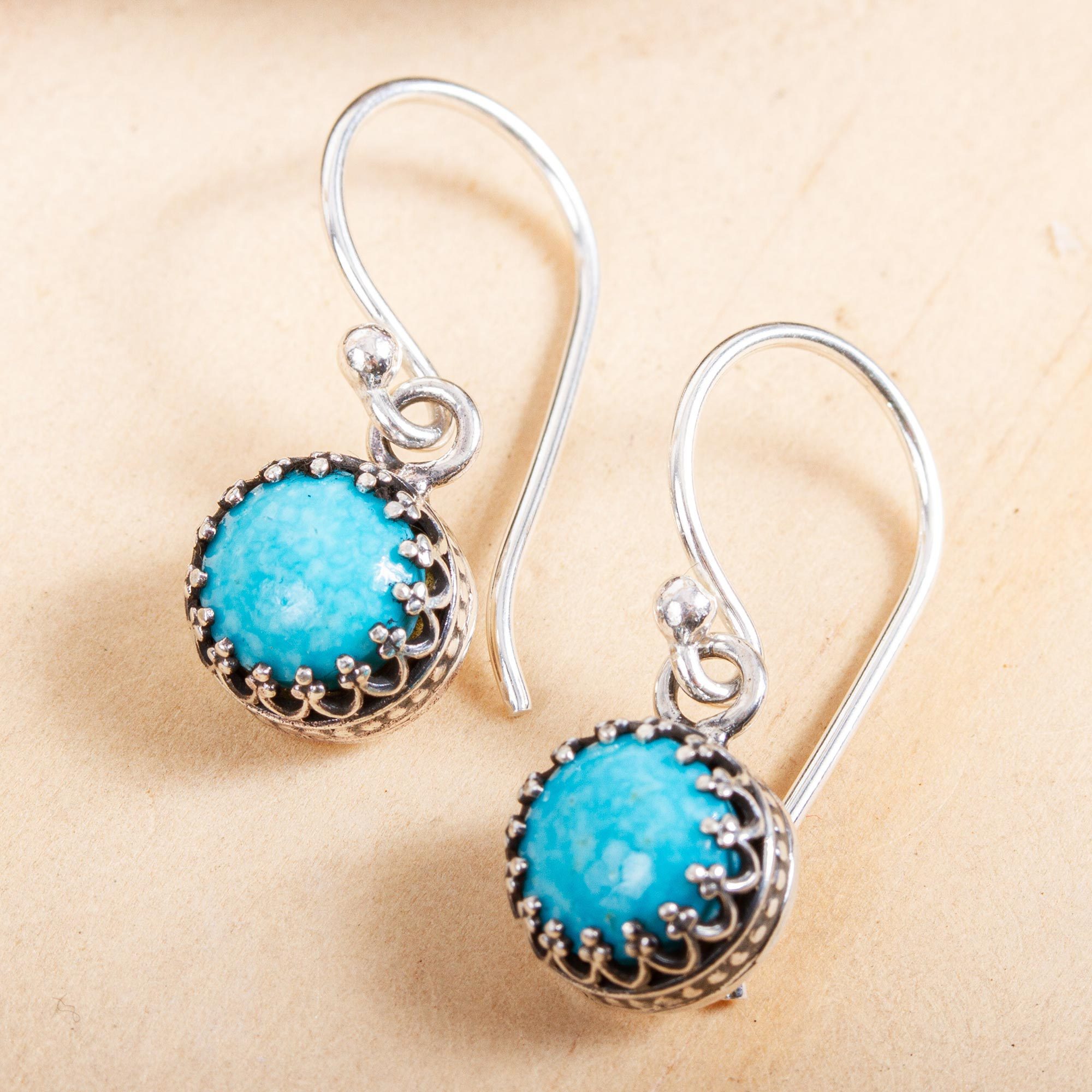 Working with 950 silver sourced from the famed Taxco mines, Mexico's Alon Diller creates these pretty dangle earrings. The earrings feature ornate crown settings which hold cool cabochons of natural turquoise.