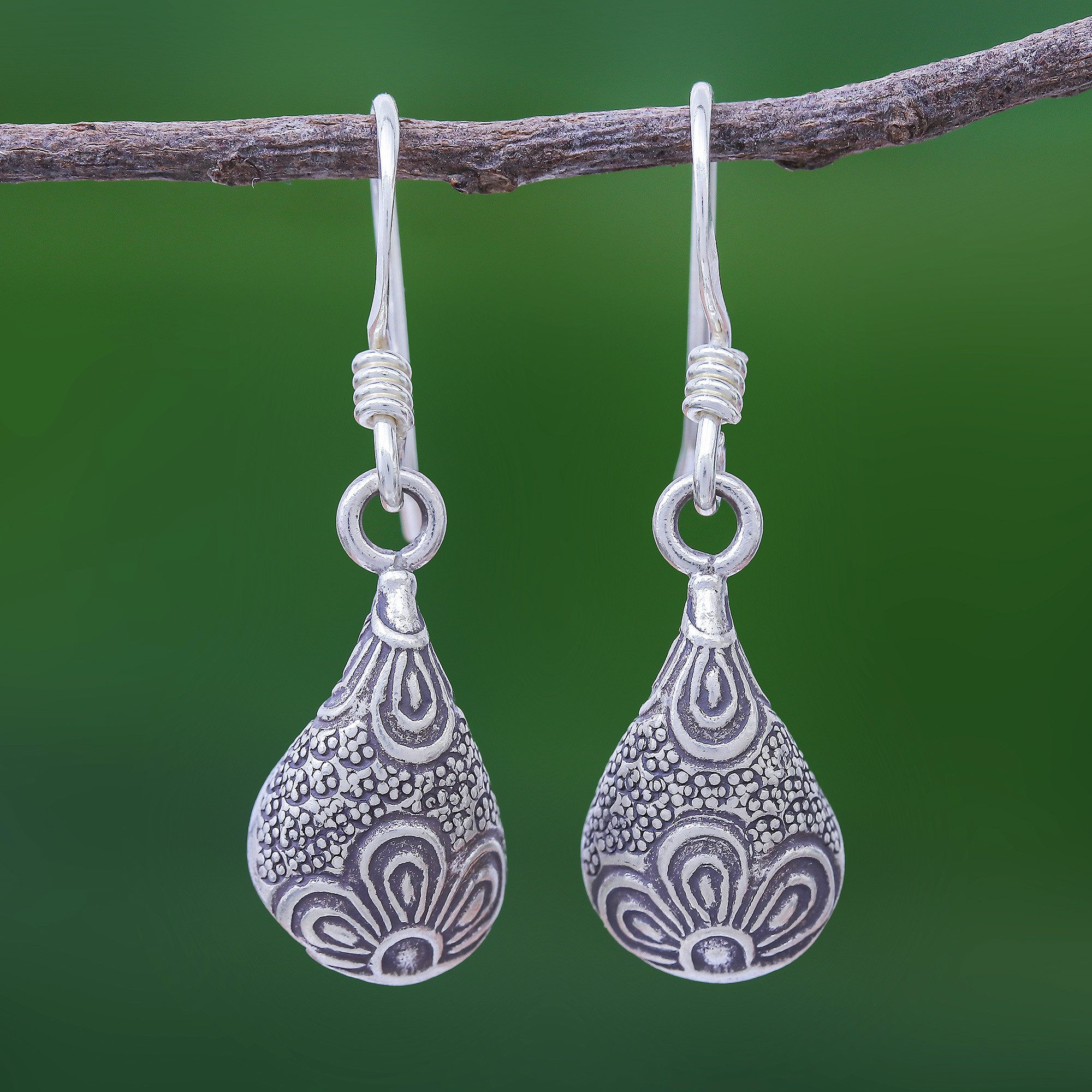 Thailand's Pakaon Sojintarit presents these flower-adorned dangle earrings, handcrafted from 950 silver. The droplet-shaped earrings dangle from sterling silver hooks and feature a combination finish that accentuates the artist's attention to detail.