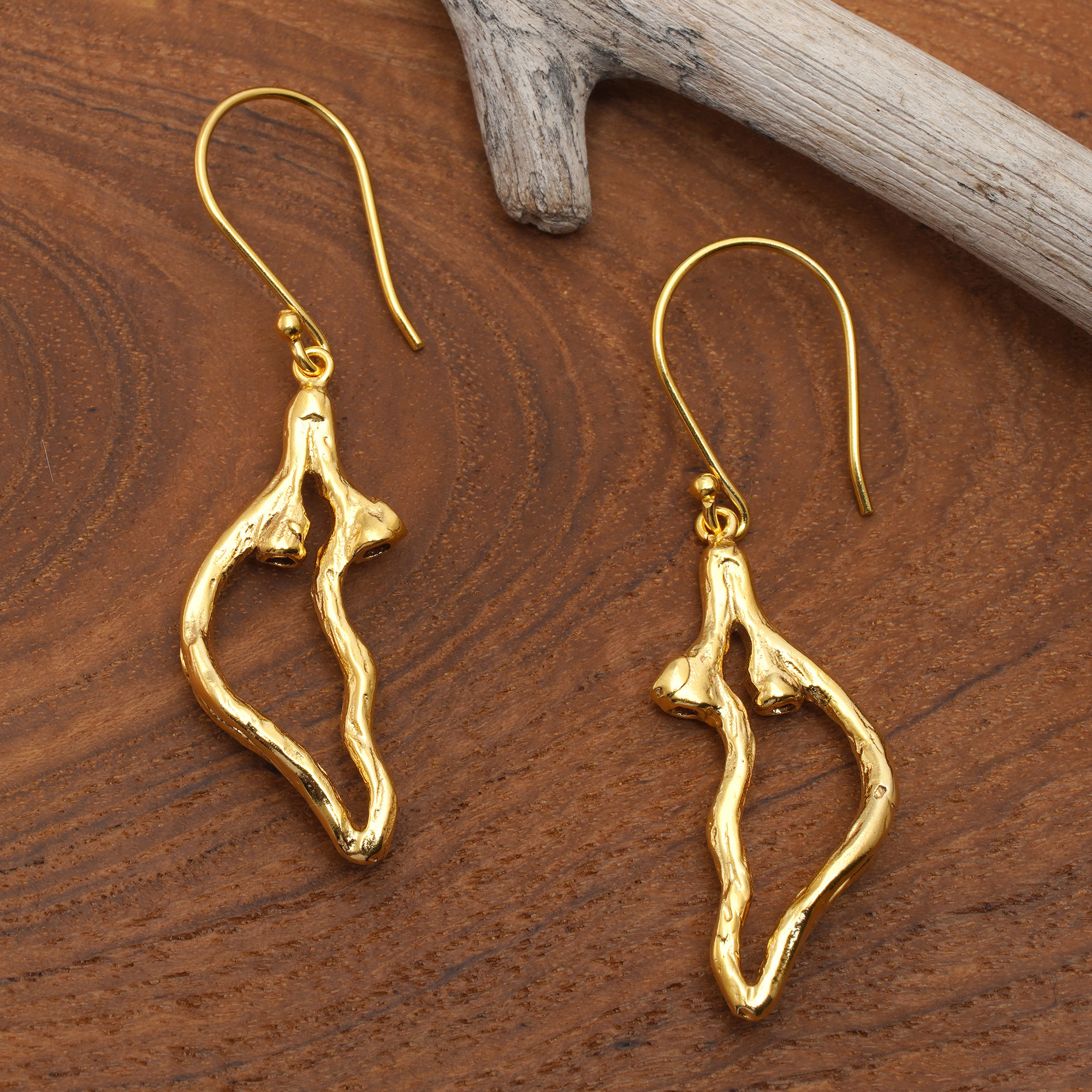 These abstract dangle earrings are cleverly designed by Bali's Suana Yasa in the shape of two pieces of a heart. They combine brass durability with the opulent gleam of 18k gold plating, bringing an extra touch of sophistication to these modern accessories.