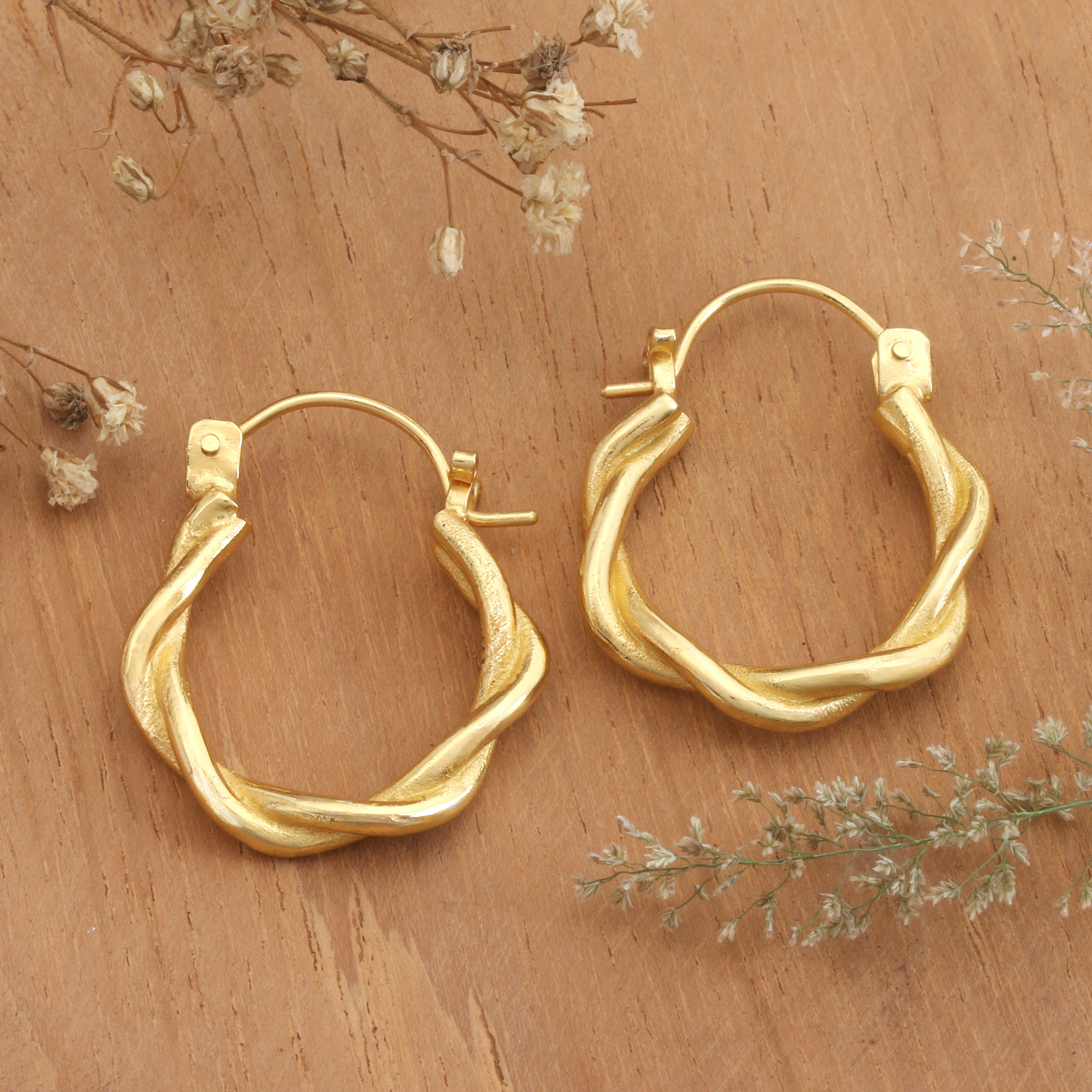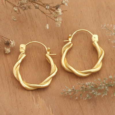 Twisted lines embrace each other to crown your days. Bali's Dewa Nyoman Oka shows talent in the delicate details that compose these hoop earrings, whose semi-abstract vibe seems to imitate a nimbus of 18k gold-plated brass.