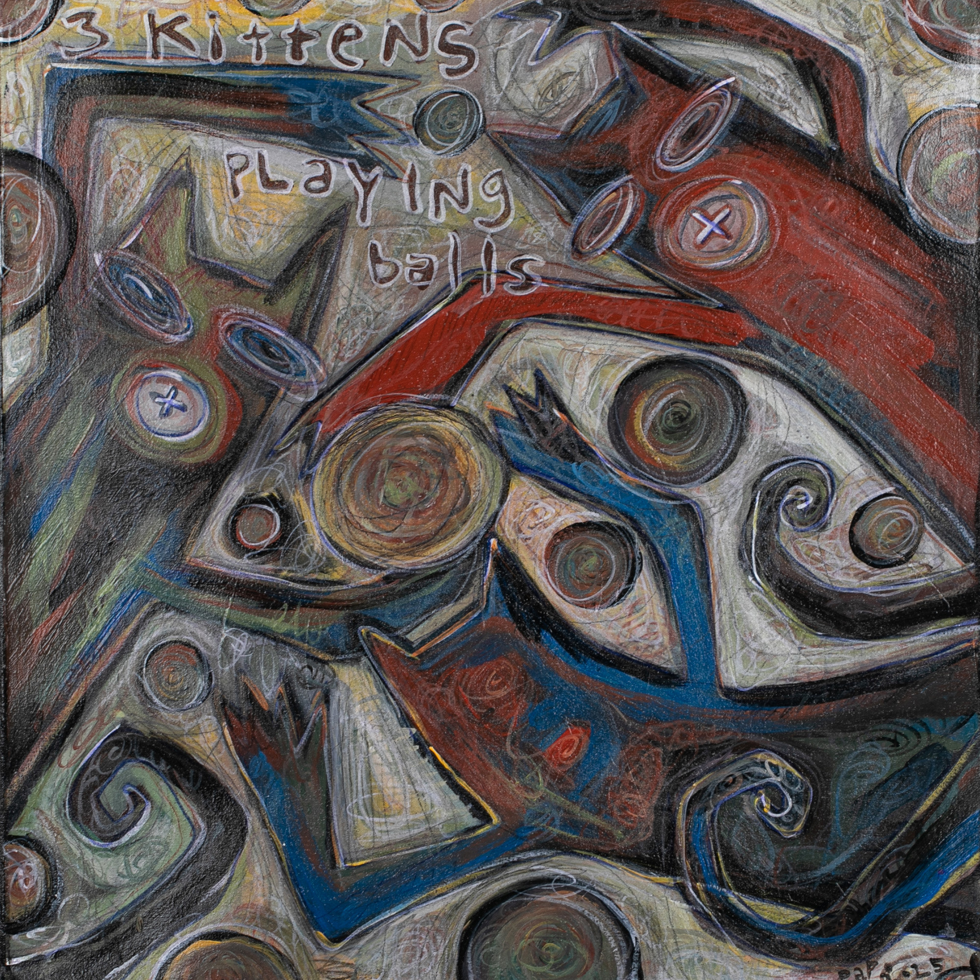 Abstract Modern Acrylic Ink Pencil Painting with Cat Motif, '3 Kittens Playing Ball'