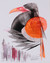 This remarkable acrylic painting by Indian artist Sunil Jaiswal blends bold avian imagery with subtle architectural motifs to striking effect. An exotic bird dominates the composition, its form sculpted with sweeping black brushstrokes and sharpened geometric accents. Vibrant orange elements, such as the curved beak and a large circular wing or shield-like form, add a dramatic pop of color, creating an intriguing contrast against the monochromatic textures. The creature's eye, sharply defined and expressive, anchors the viewer's attention. Beside the bird, the artist portrays a delicate cityscape in soft pinks, greys and purples. The abstracted domes and arches at the bottom evoke the essence of Indian architectural silhouettes, grounding the bold, modern bird in a subtle cultural landscape.
