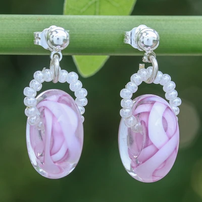 Ethereal pink ribbons embrace Alexx Cheng's dangle earrings, inspired by avant-garde and whimsical trends. Thai handblown glass techniques compose the abstract pattern that adorns both pendants, held by glass beads in matching ivory hues. Sterling silver posts complete the pair, allowing you to wear their sweet essence with comfort.