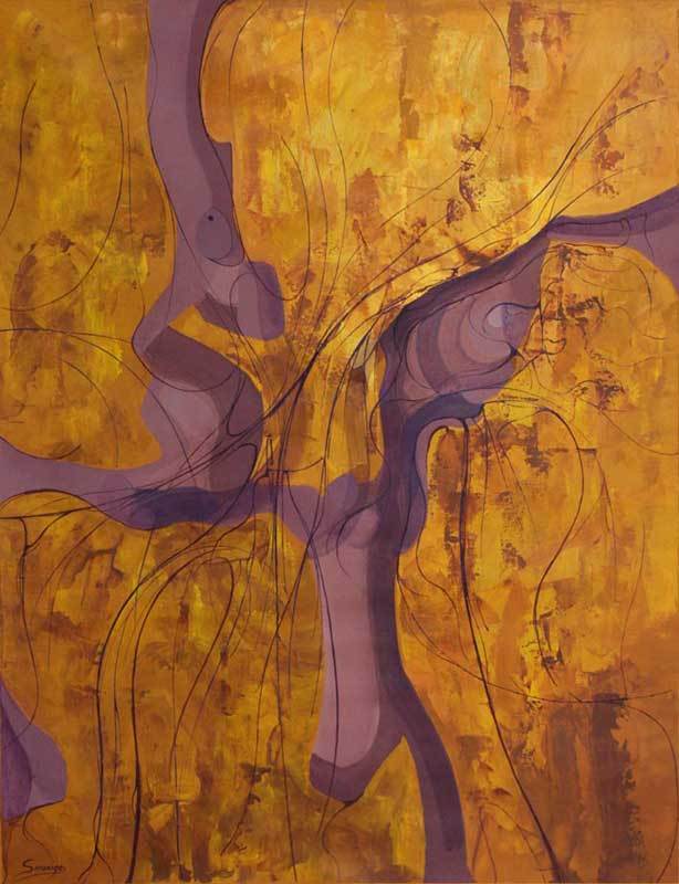 Radiating from the center of a warm golden canvas, waves of lilac and violet move gracefully, as though dancing. A closer look reveals layers of yellow, ochre and brown that host lyrical line. A music lover, artist Sessarego explains, "This painting doesn't represent an opera. It takes its inspiration from opera to free the emotions that produce this creation."