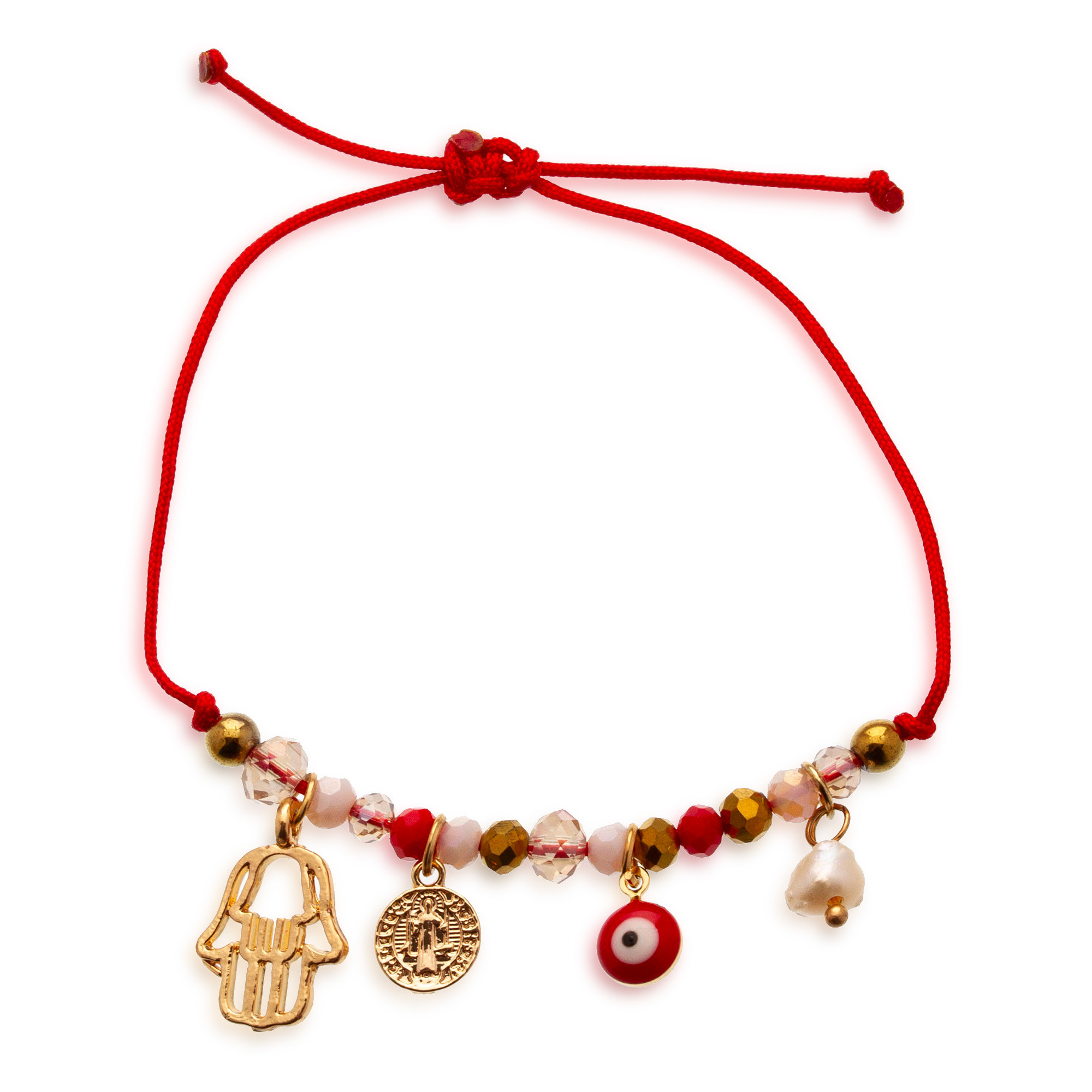 Protect your days with a sublime red hue of fire and romance. Mexico's Alejandra Gallardo combines 24k gold-plated brass with crystals and cultured pearls. A Nazar bead and a hamsa pendant complete the piece, while a silk sliding knot allows a flexible fit.