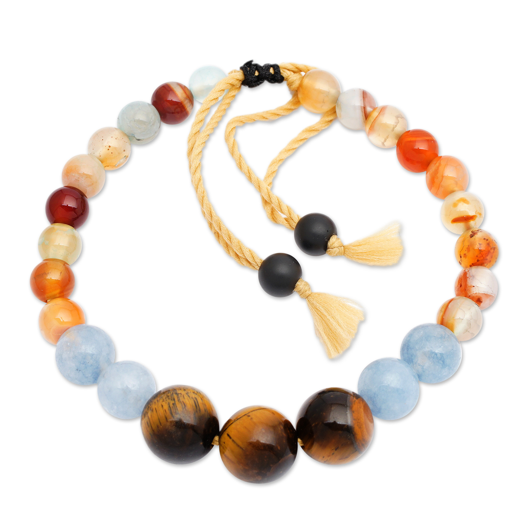 Stunning aquamarine and tiger's eye beads reunite their hues in this bracelet, made to infuse your days with Bali's serene ambiance. Artisan Made Masna thinks about the island's carefree nature while crafting this meditation amulet, equipped with an adjustable sliding knot in a tender beige hue.