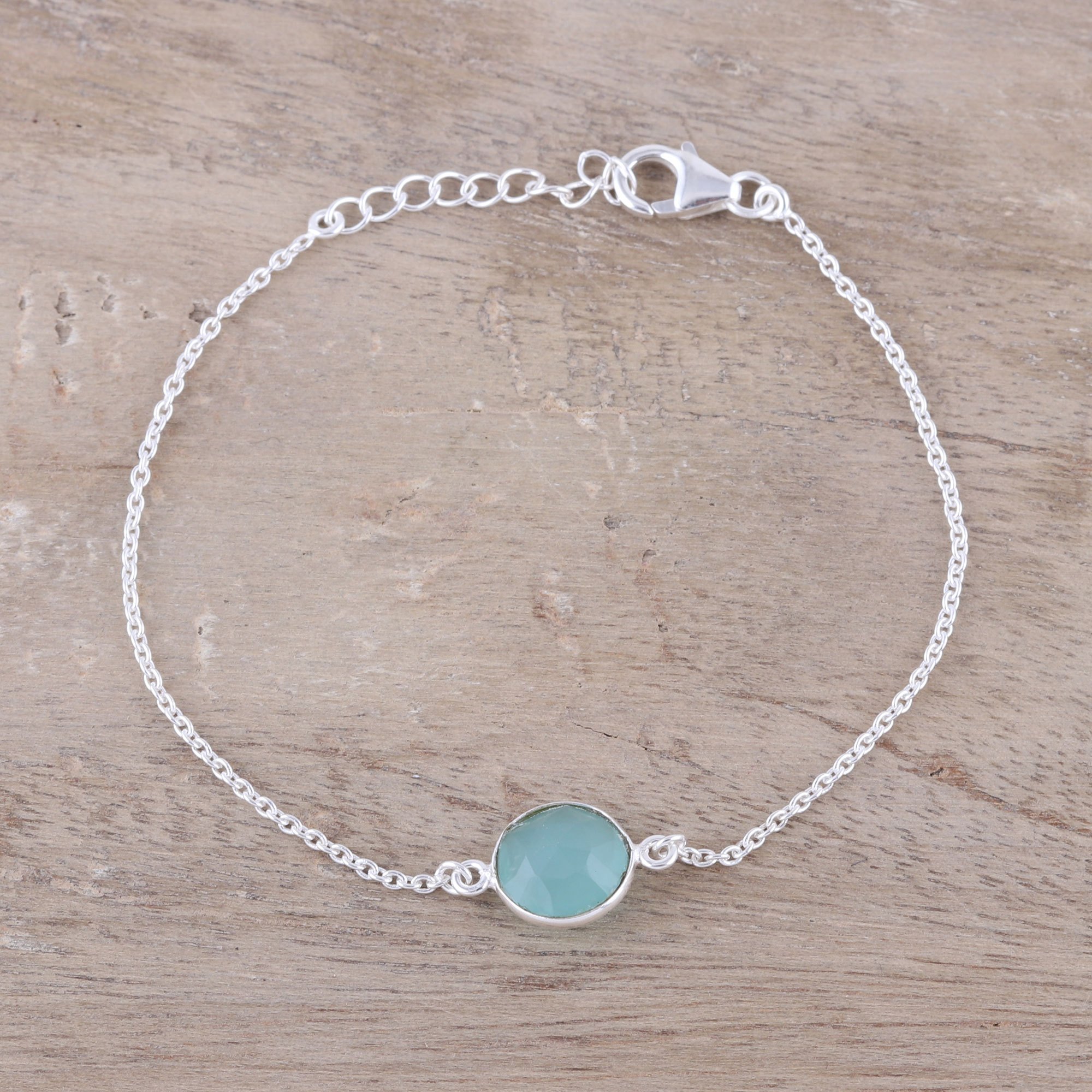 Dazzling brightly, 3.5 carats of faceted round chalcedony shimmer in a sterling silver bezel setting. Designed by Neetu Barathi from India, this gorgeous pendant bracelet is perfect for all occasions. The rich, aqua colors seen within the stone evoke a beautiful ocean.