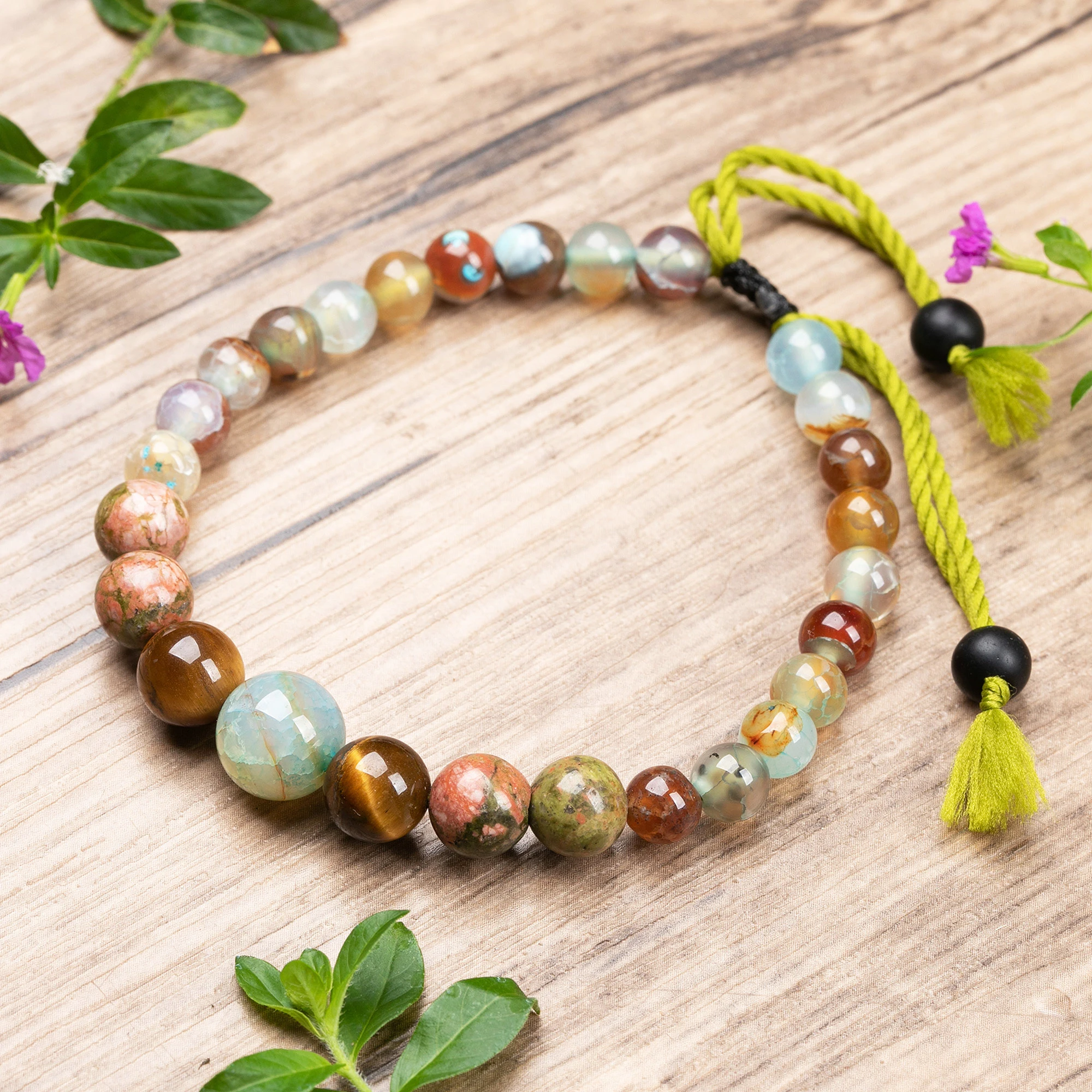 • Aquamarine, tiger's eye, amethyst, polyester cord