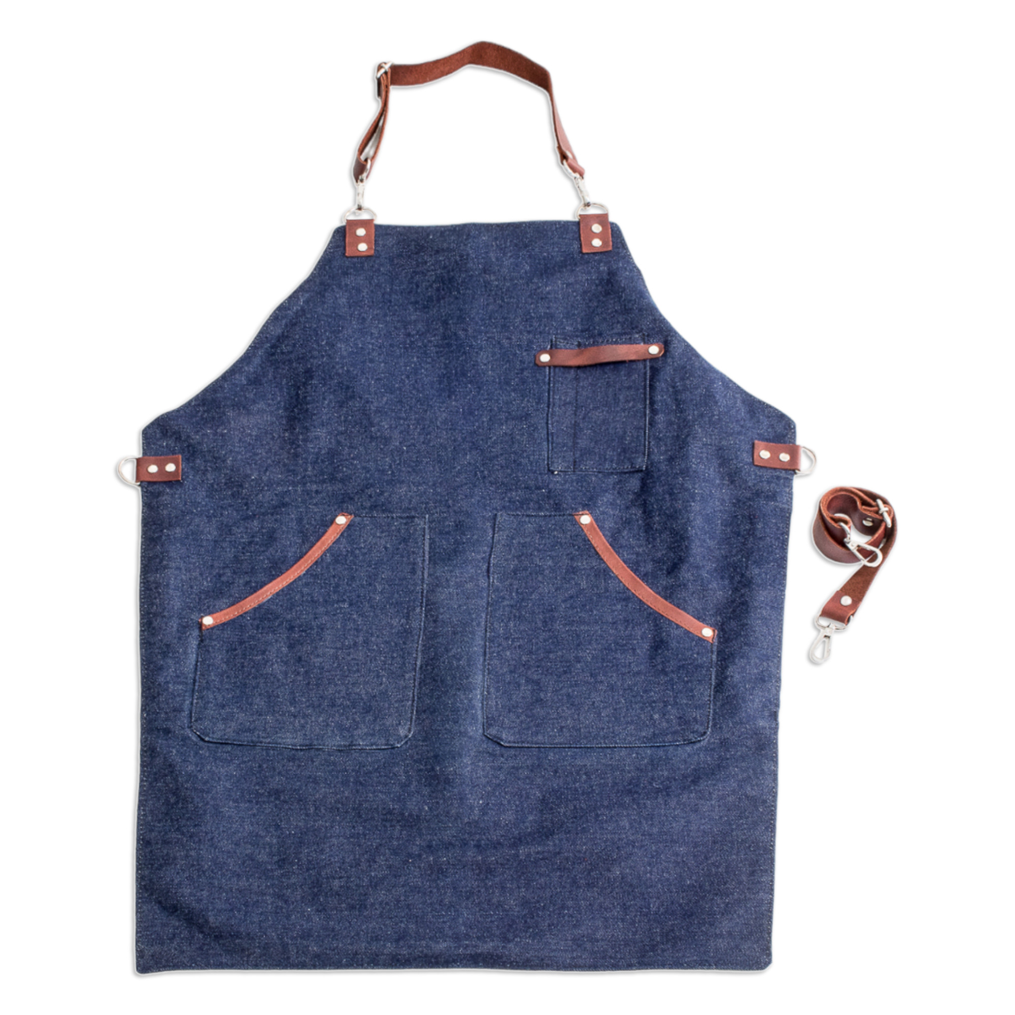 Made to be your best companion on those culinary adventures, Laura Leticia Burrion's newest design infuses those cooking sessions with elegance. The apron, made in Guatemala from resilient blue canvas textile, features adjustable leather straps for fitted wear. Three generous pockets ensure convenient use, while brass fixtures promise a design of long-term durability.