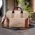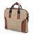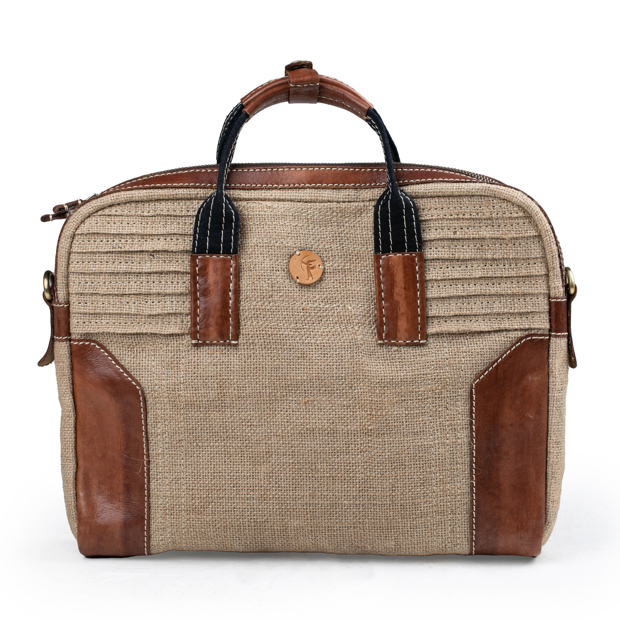 • Leather accents, jute fiber, antiqued brass; canvas lining