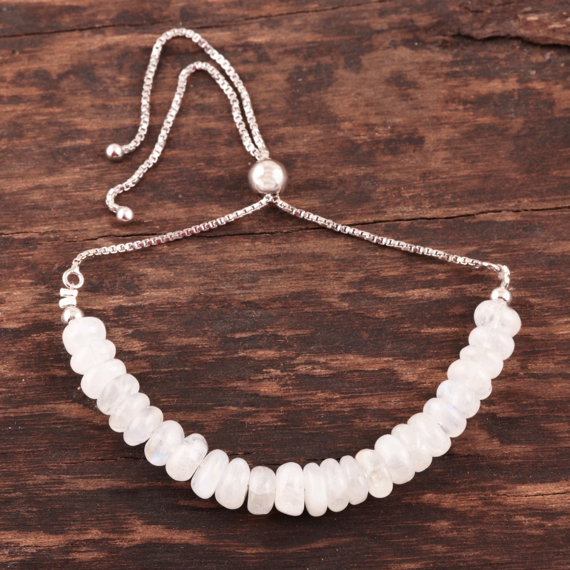 Centering sterling silver box chain bathed in rhodium, a strand of natural rainbow moonstone beads are charming and delightful. Harshita Sharma designs this Indian bracelet, which adjusts with a sliding bead.