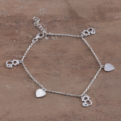 Adjustable Silver Bracelet with Heart and Hollow Cat Charms, 'Kitty Love'