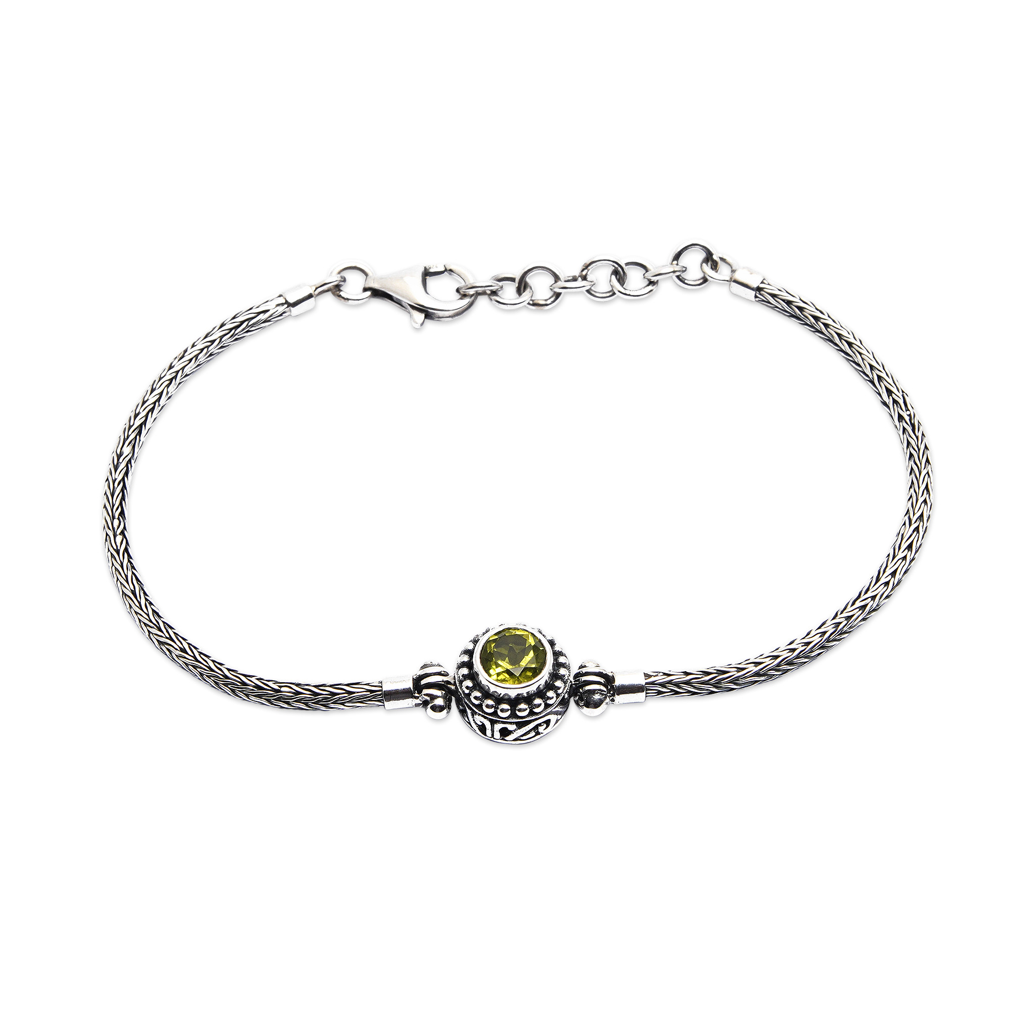 Sterling silver dazzles with a touch of verdant splendor in this pendant bracelet where traditional Balinese craftsmanship reveals itself through meticulous detail work. A sparkling peridot stone creates a captivating focal point, adorned with the region's traditional motifs. Artisan Dewi Putera's chic accessory transforms your wrist into a showcase of artistry that transcends trends.