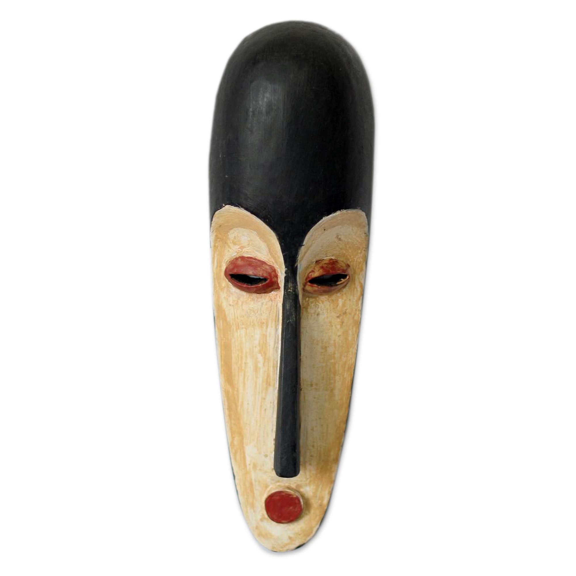 Arched eyebrows frame the canny eyes of a spirit of the forest. Long and narrow, the serene visage appears in black, red and ivory. "One of the fundamental religious beliefs shared by Fang people was that of the necessity to protect and nurture the spirit of the dead, believed to dwell in the forest," says artisan Nana Adu Amankwapam I. "Anytime a ritual is to be performed in the forest to seek the views of the ancestors, this mask is worn."