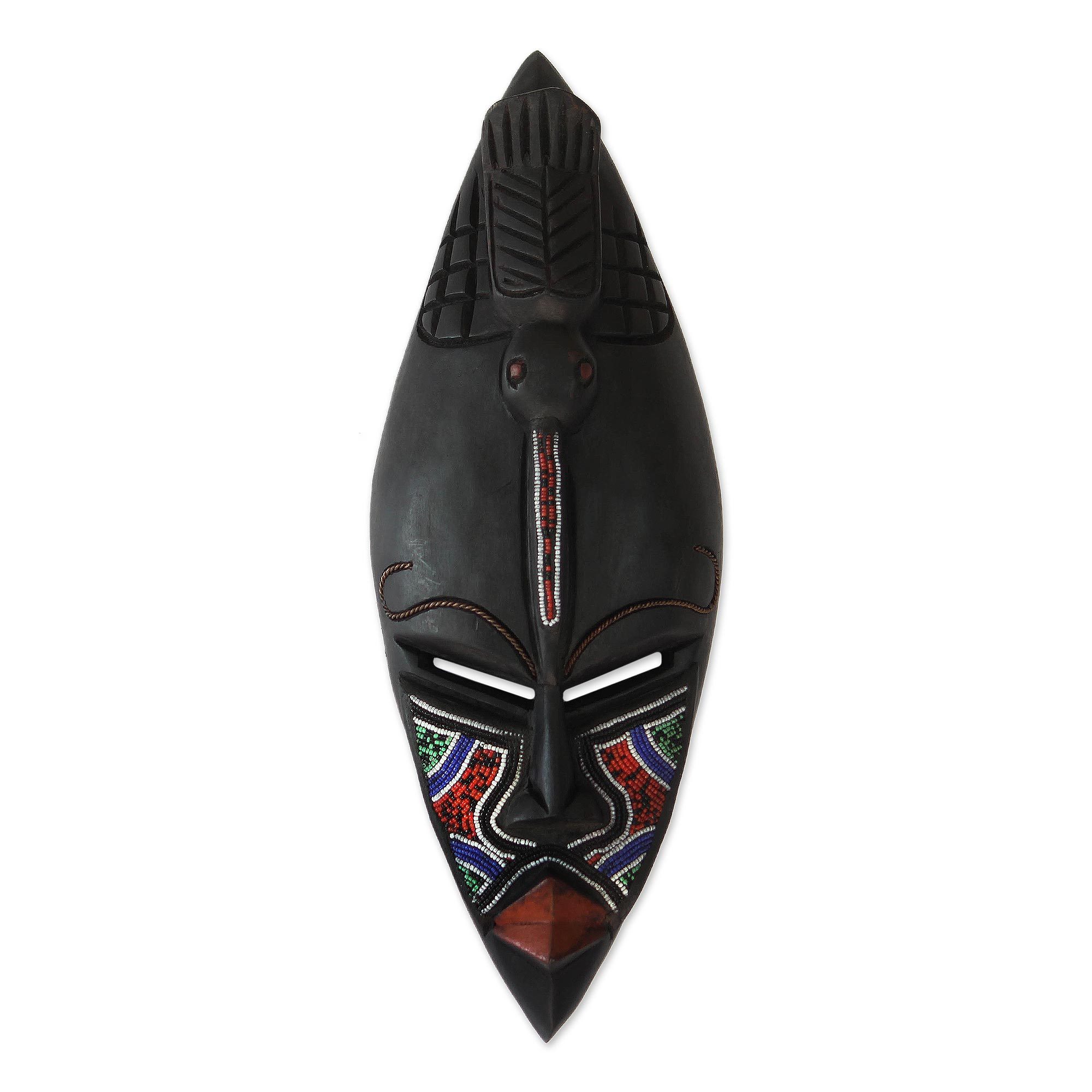 This extraordinary mask is inspired by the traditions of the Dzonu people of Ghana's Volta Region. Featuring a bird looking downward, it was usually gifted to brave warriors. Evelyn Kafui Ahianyo designs the mask, carved from local sese wood and adorned with colorful glass beads or dzonu, from which this tribe takes its name.