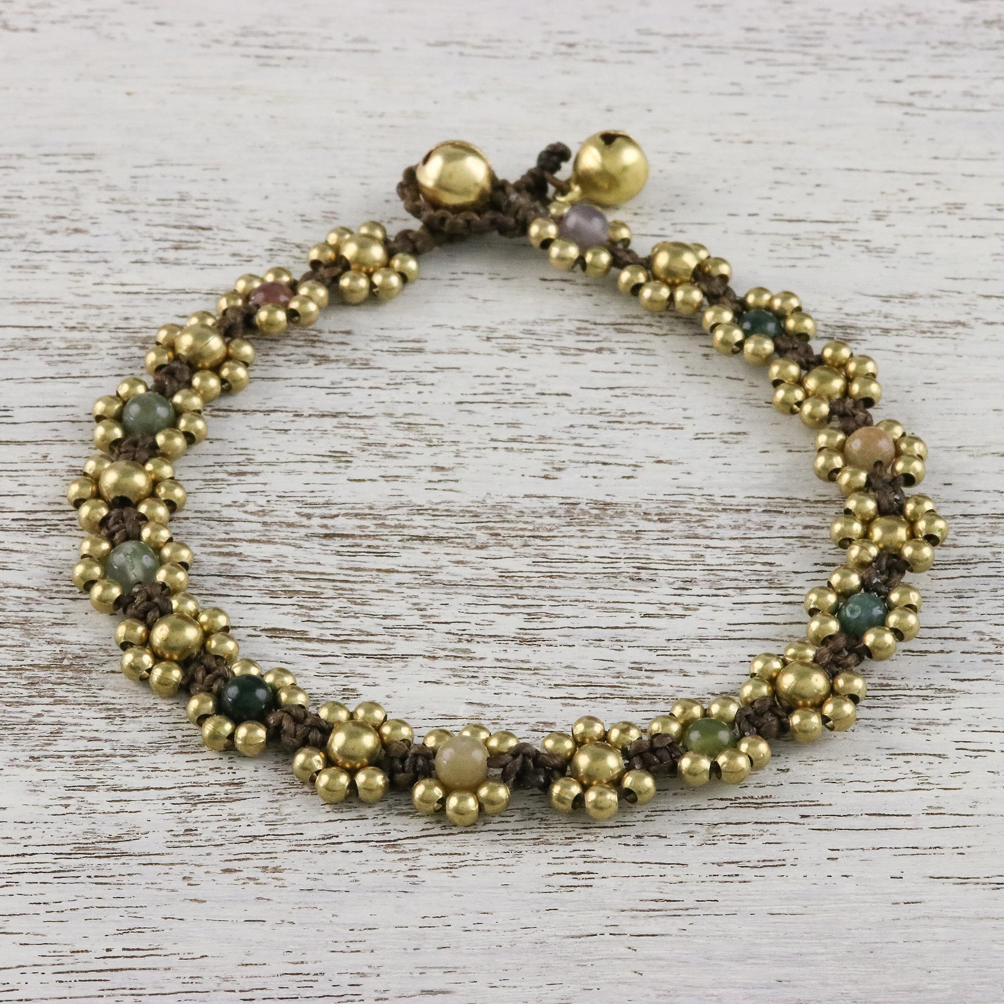 For a dreamy accessory, this anklet is designed by Thai artisan Tiraphan Hasub. She selects stones of colorful agate, beading them alongside gleaming brass to circle the ankle. This accessory closes with an adjustable button clasp with bells that ring musically.