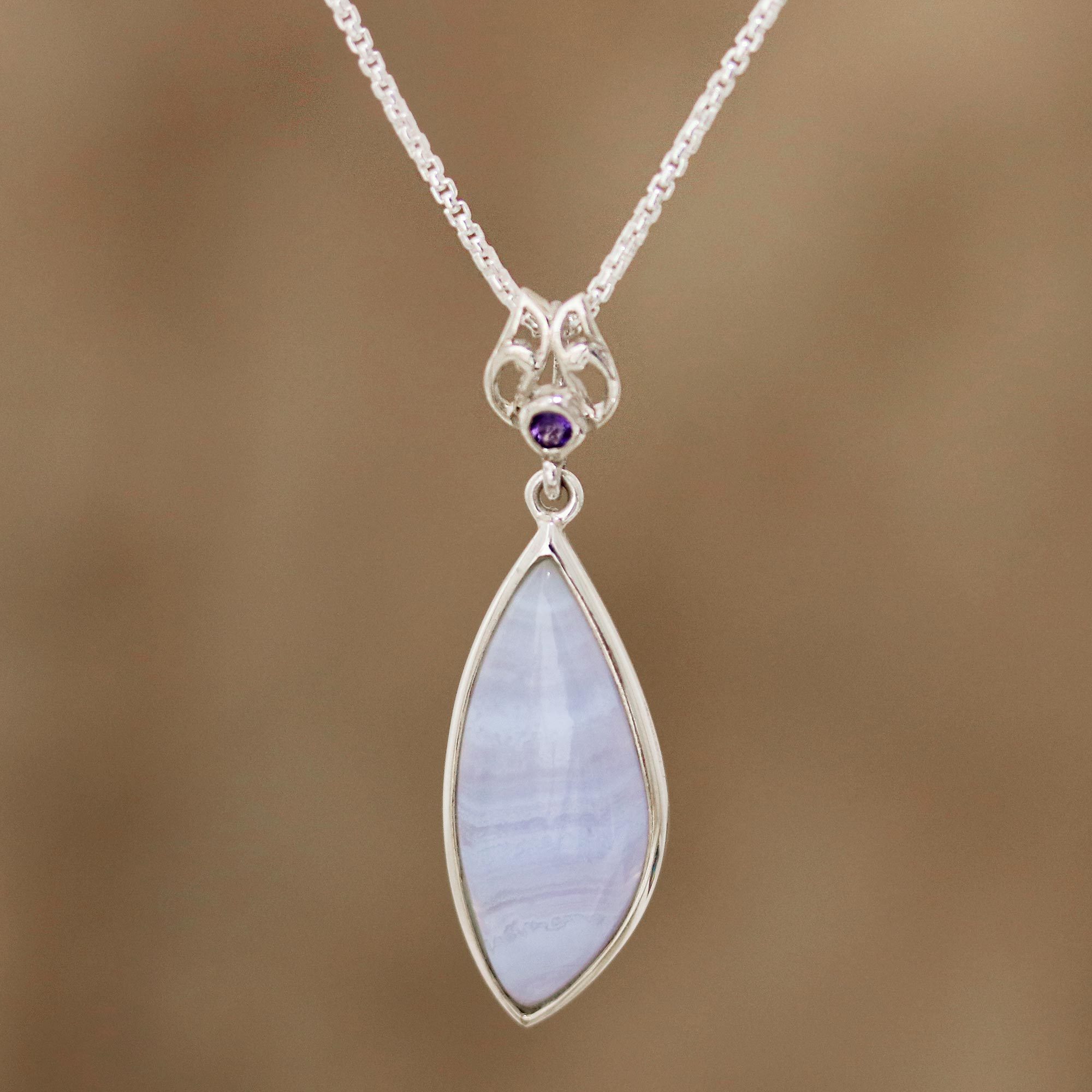 Nicknamed "blue lace," a lovely cabochon of agate is framed by sterling silver, accented with amethyst. Shubhra Singh designs this Indian pendant necklace, which circles the neck with sterling box chain.