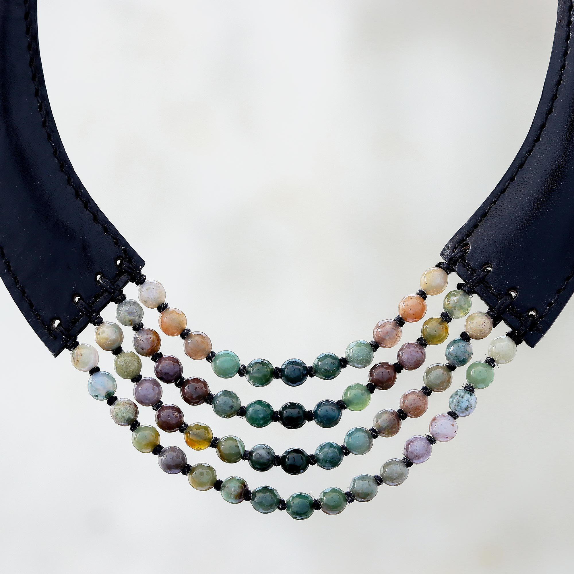 Showcasing various colors, dozens of agate beads center this stunning necklace from Thailand. Chaloemphon presents this necklace, which features bands of black leather that flank the beaded strands. This necklace caresses the neck with strands of black cord that adjust with a raintree wood bead. Petite beads of bone accent the ends of the cord.
