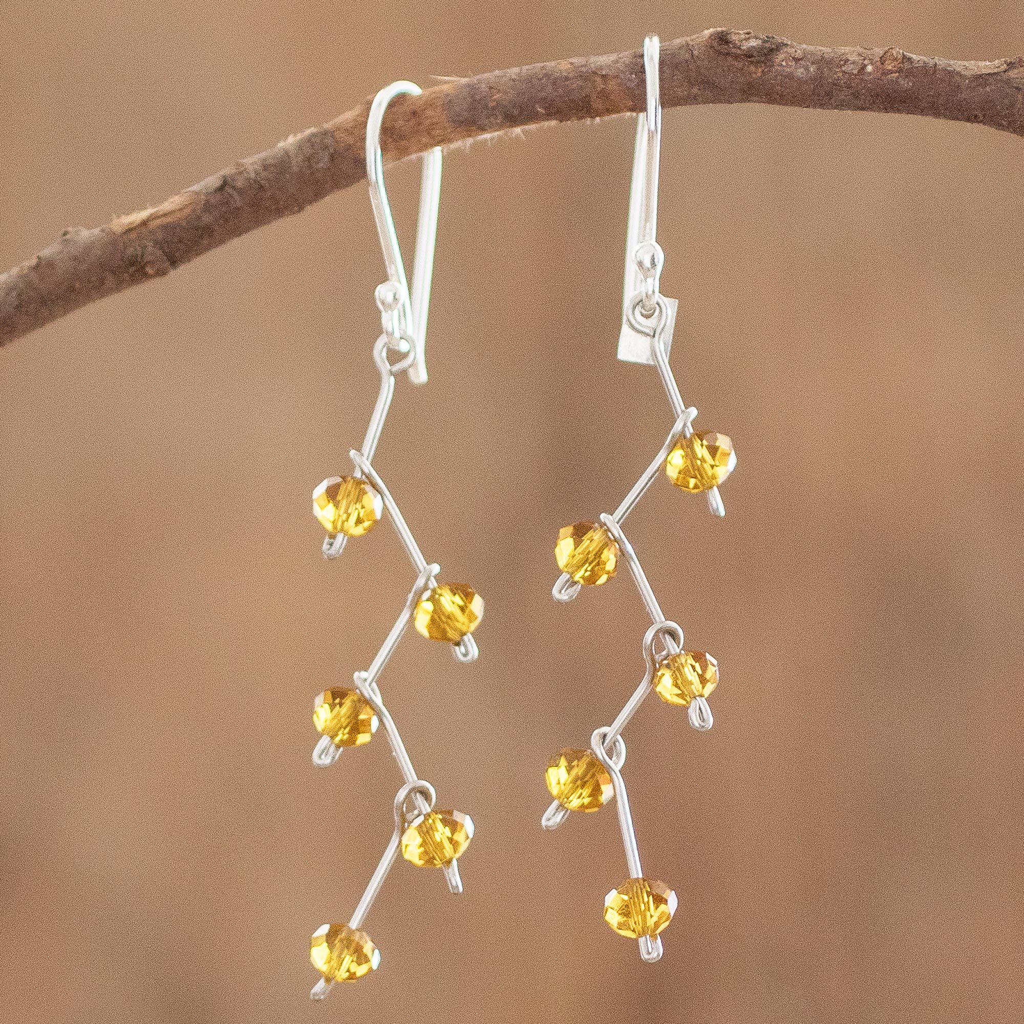 On these earrings, amber colored crystals zigzag delicately from stainless steel wires, which are mounted on sterling silver hooks. They are the creation of Domingo Reanda of Guatemala, who took his traditional weaving skills into new directions, including jewelry making.