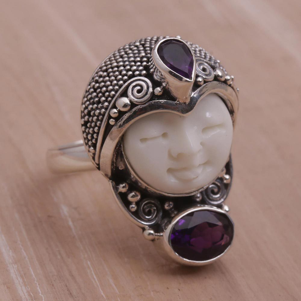 Amethyst and 925 Silver Face Shaped Ring from Bali, 'Moonlight Prince'