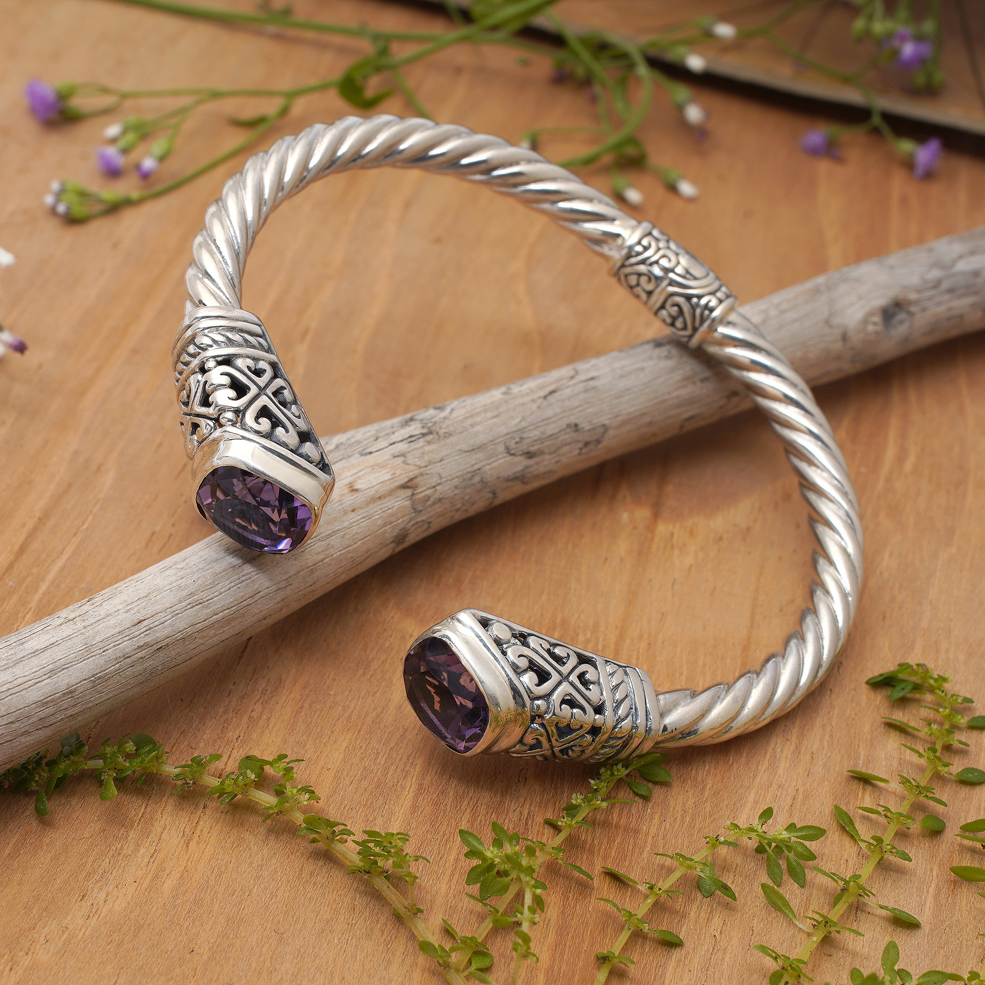 Amethyst and 925 Silver Rope Design Cuff Bracelet from Bali, 'Altar Swirl'