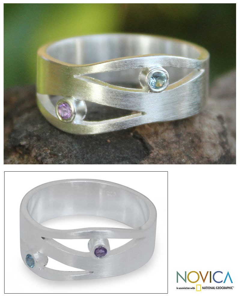 The brushed textures of this sterling silver ring reveal the dazzling beauty of amethyst and blue topaz. Designed by Thailand's Jantana, this original band ring is crafted by hand of sterling silver.