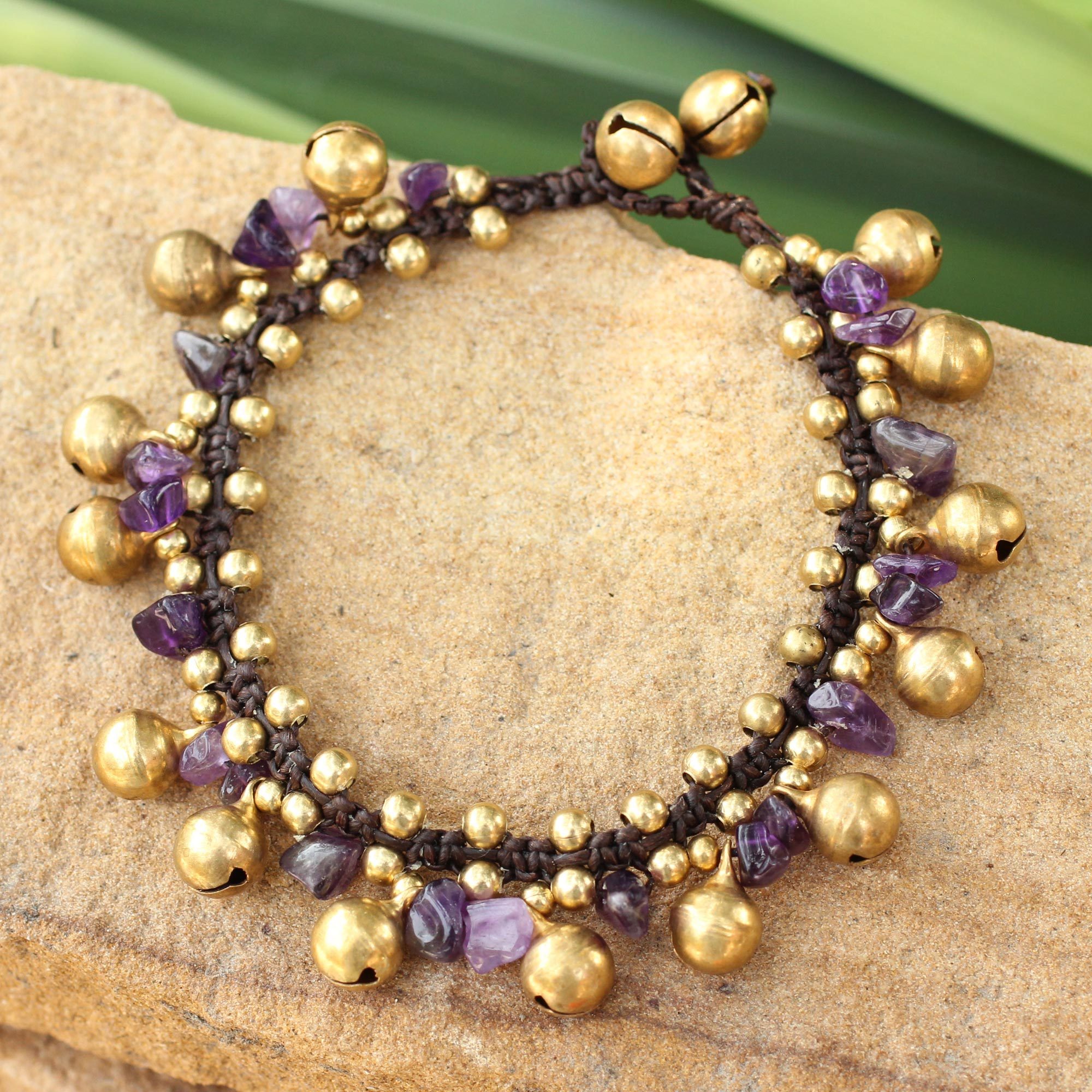 Amethyst and Brass Beaded Bracelet from Thailand, 'Thai Bells'