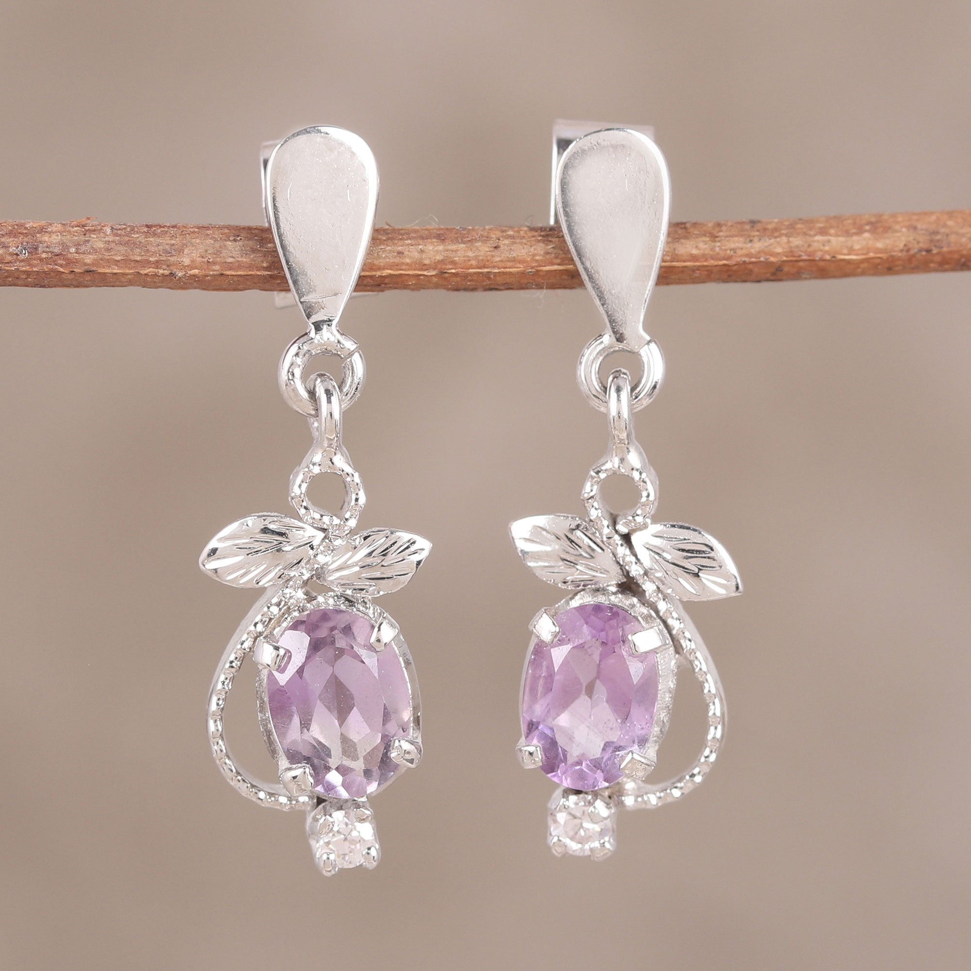 Two carats of faceted amethyst sparkle magically in this pair of dangle earrings from India's Alok Jain. Evoking images of a plant bursting with luscious fruit, they feature an oval gemstone nestled within a swirl of rhodium-plated sterling silver. A cubic zirconia sits beneath the amethyst stones, which are crowned with two shiny leaves.