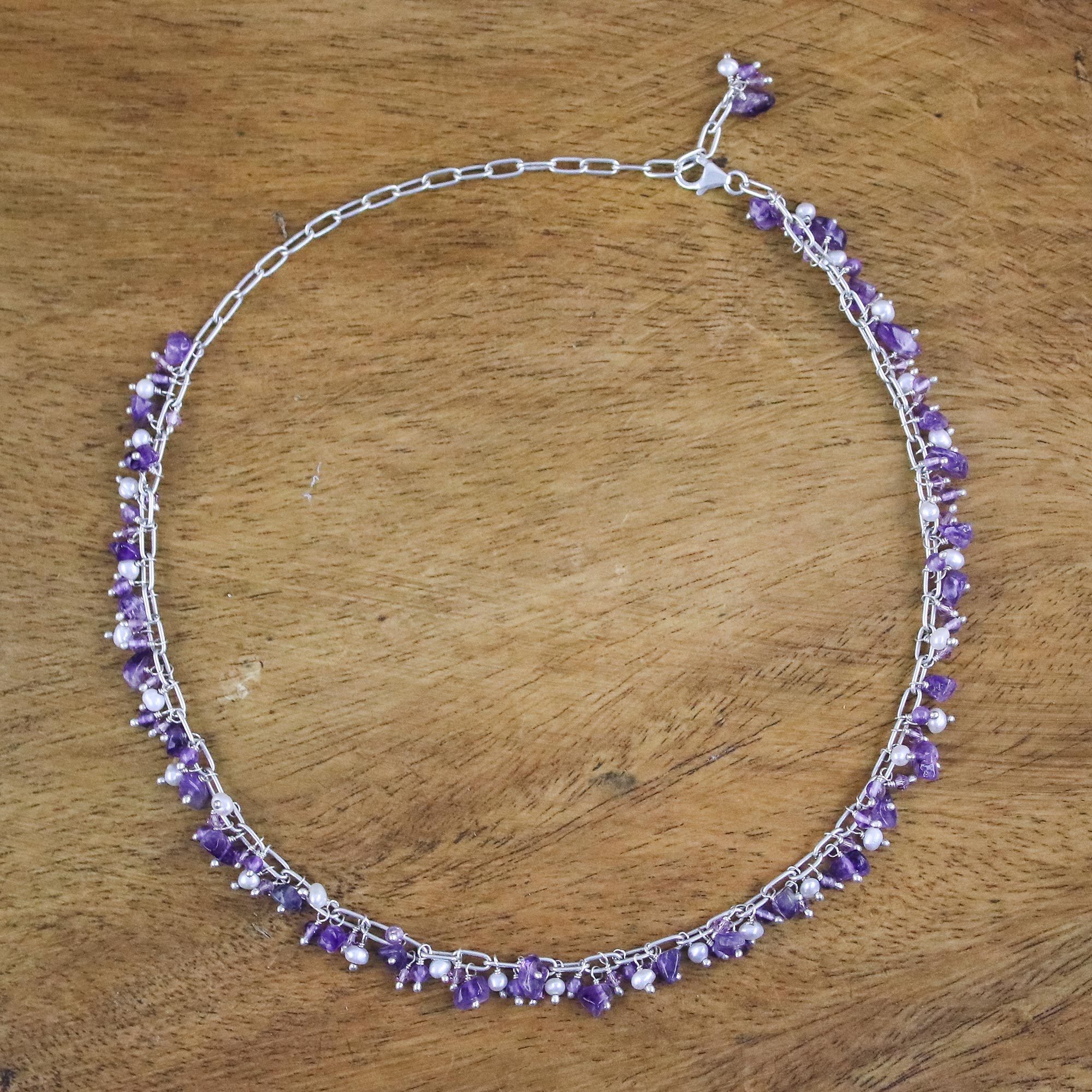 Amethyst and Cultured Pearl Beaded Necklace from Thailand, 'Thai Magic'