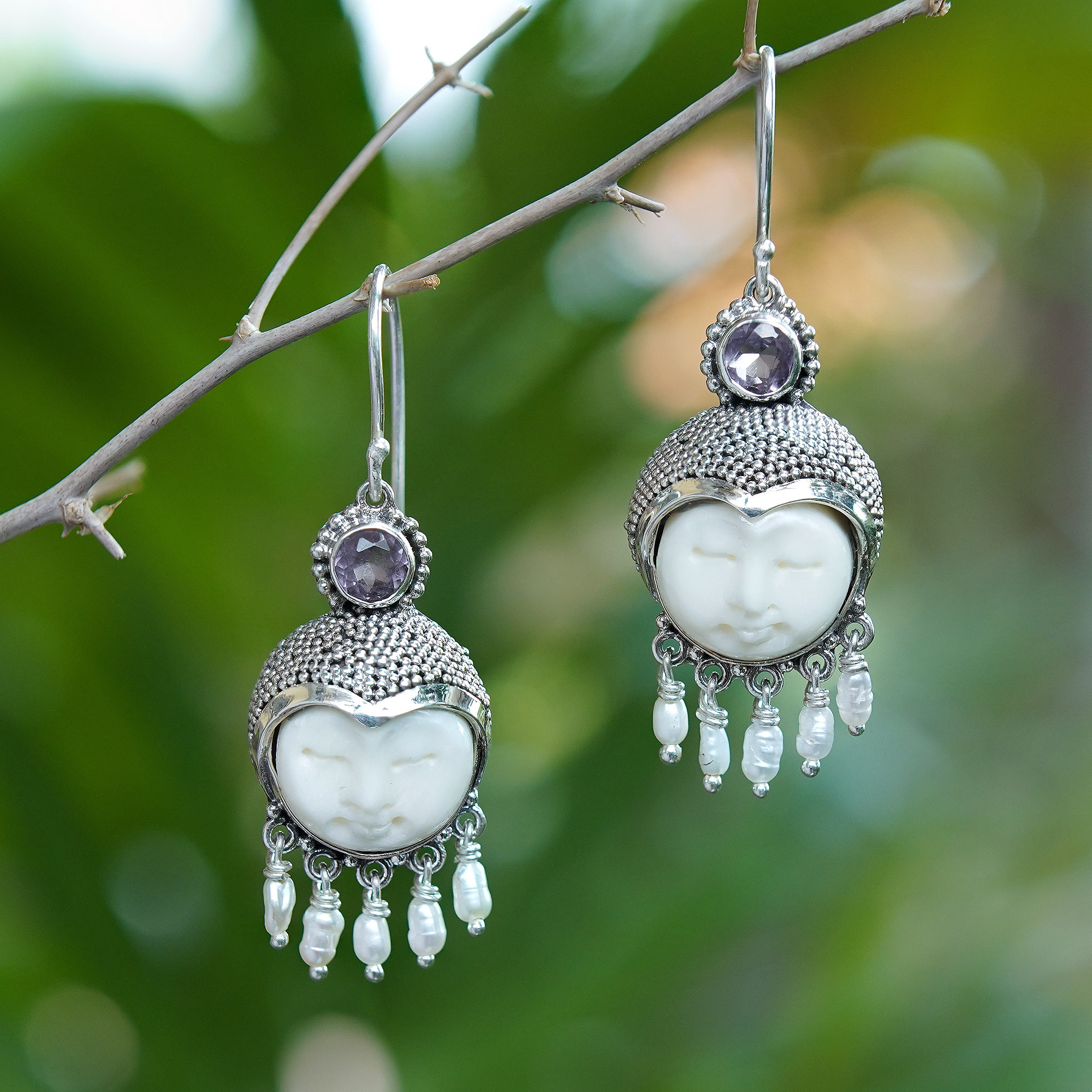 The serene faces of two sunshine princes are hand-carved of bone, featured in a stunning pair of Balinese dangle earrings. Designed by Buana, each earring is crafted with a crown of sterling silver, elaborated with sparkling amethyst at the top and dangling cultured pearls at the bottom.
