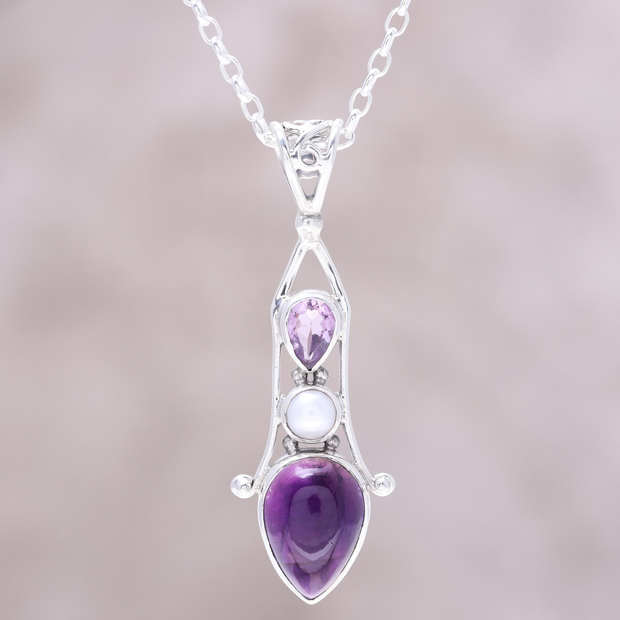 Teardrops of amethyst elegantly frame a freshwater cultured pearl in this pendant necklace designed by Shanker of India. Two arms of sterling silver embrace the trio of gemstones to complete the pendant.